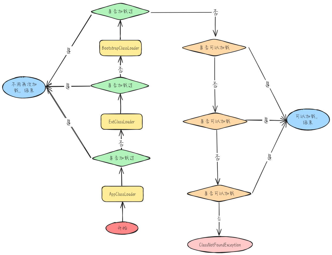 - 双亲委派机制:向上依次查找是否已加载过该类,再向下依次让各父加载器试图加载该类,只有在父类加载器无法加载该类时才尝试从自己的类路径中加载该类