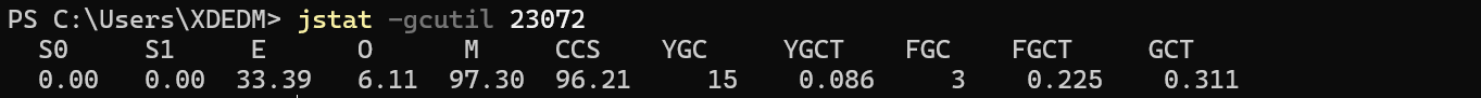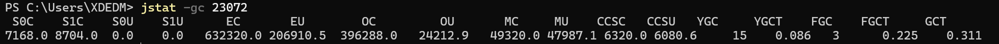 jstat -gcutil [pid] <interval> <count>:每隔 <interval> 毫秒打印一次 GC 信息,共打印 <count> 次。