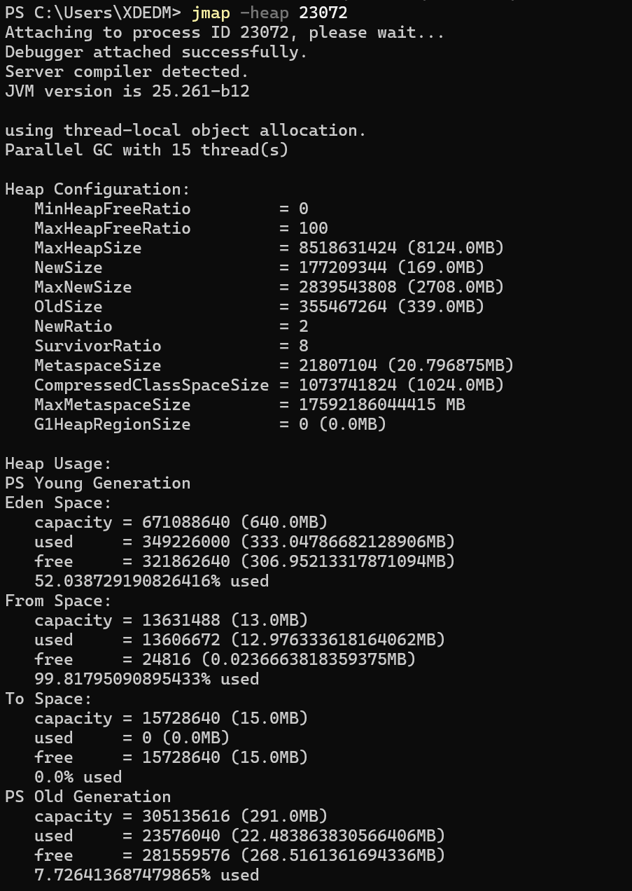 jmap -heap [pid]:打印 Java 堆的概要信息,包括堆的配置(如 Eden、Survivor、Old 区的大小)和当前使用情况。