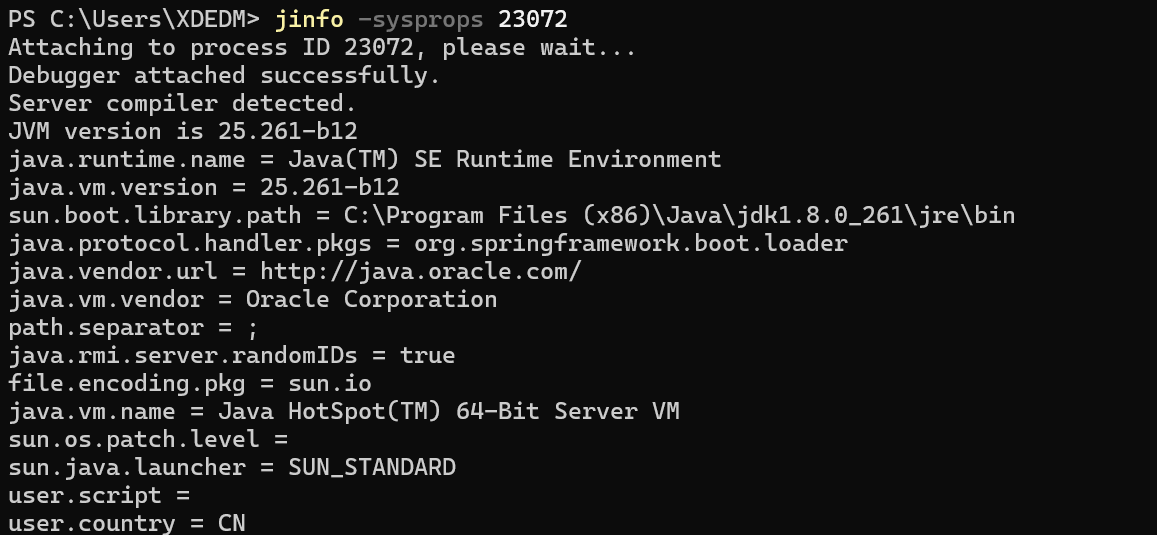 jinfo -sysprops [pid]:打印 JVM 进程的所有系统属性(通过 System.getProperties() 获取的内容)