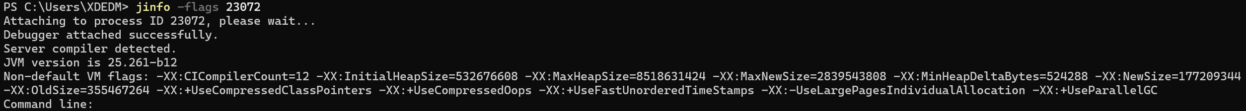 jinfo -flags [pid]:打印 JVM 的启动时的命令行参数,包括 JVM 选项和应用程序参数。