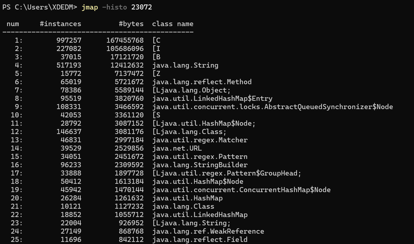 jmap -histo:live [pid]:查看当前存活的实例,按对象数量和大小排序,执行过程中可能会触发一次full gc。