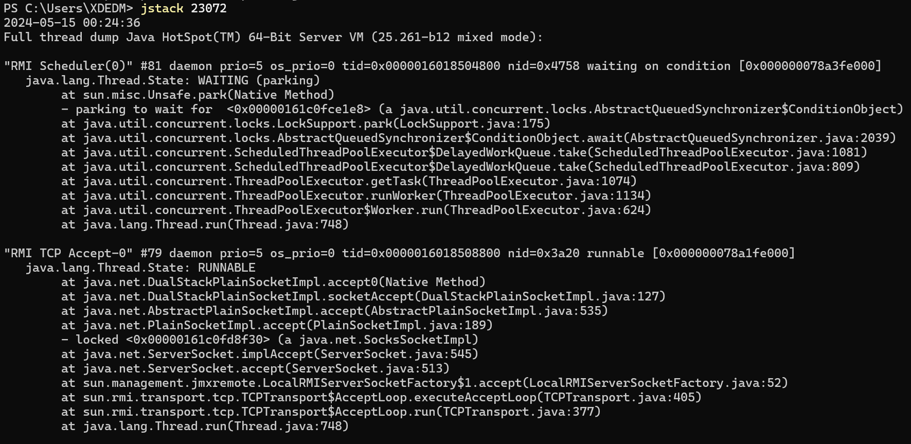 jstack(Stack Trace for Java)用于生成 JVM 中线程的当前堆栈跟踪信息。这个工具对于分析应用程序的线程状态、诊断死锁问题以及查找导致程序长时间挂起的原因非常有用。