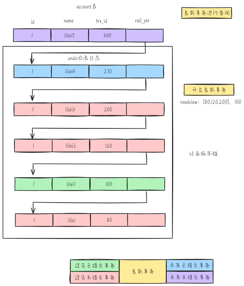 在MVCC机制下,一个事务能够看到的数据记录版本,完全依赖于该事务在执行过程中与版本链的比对结果。具体规则如下: