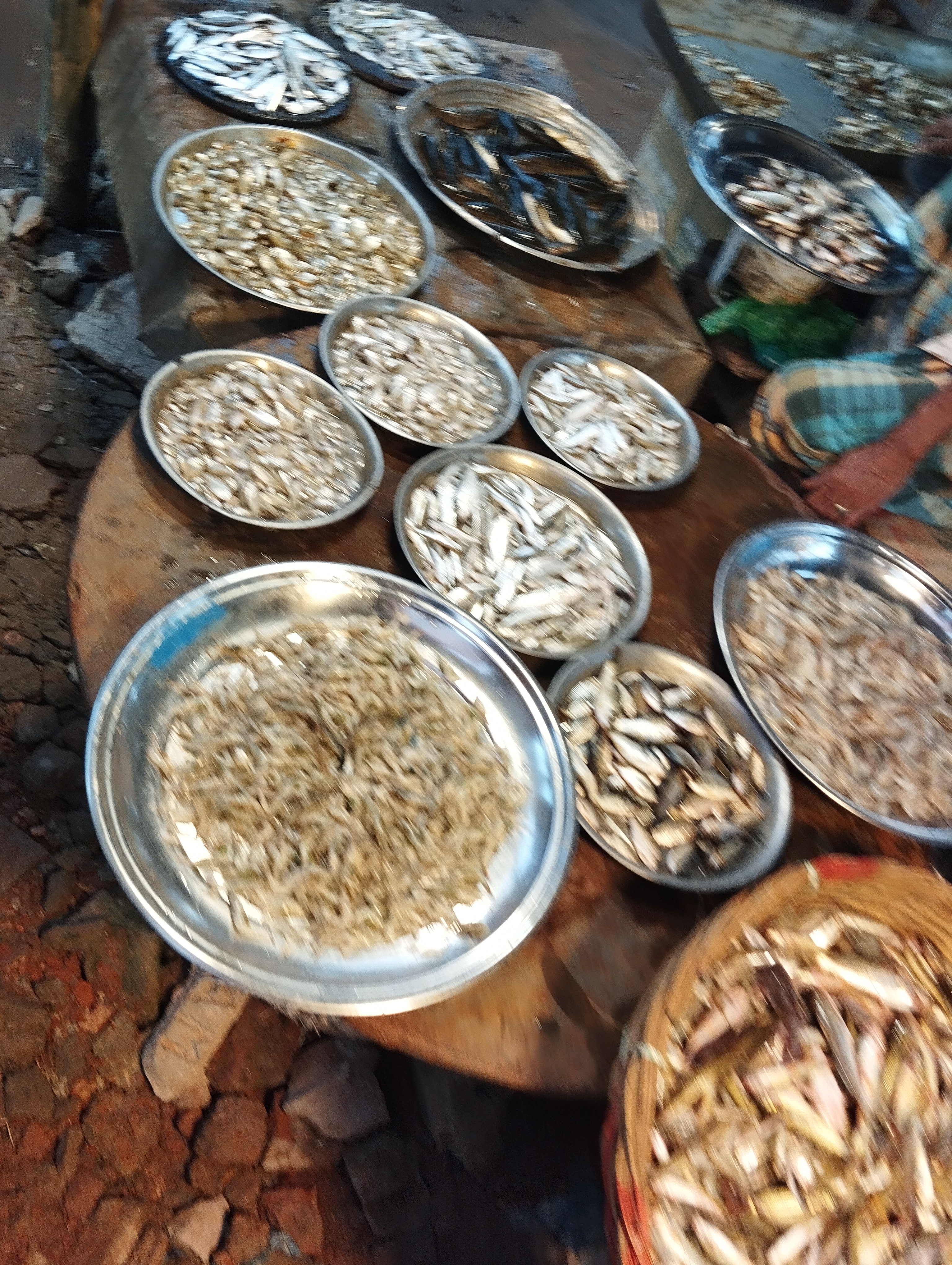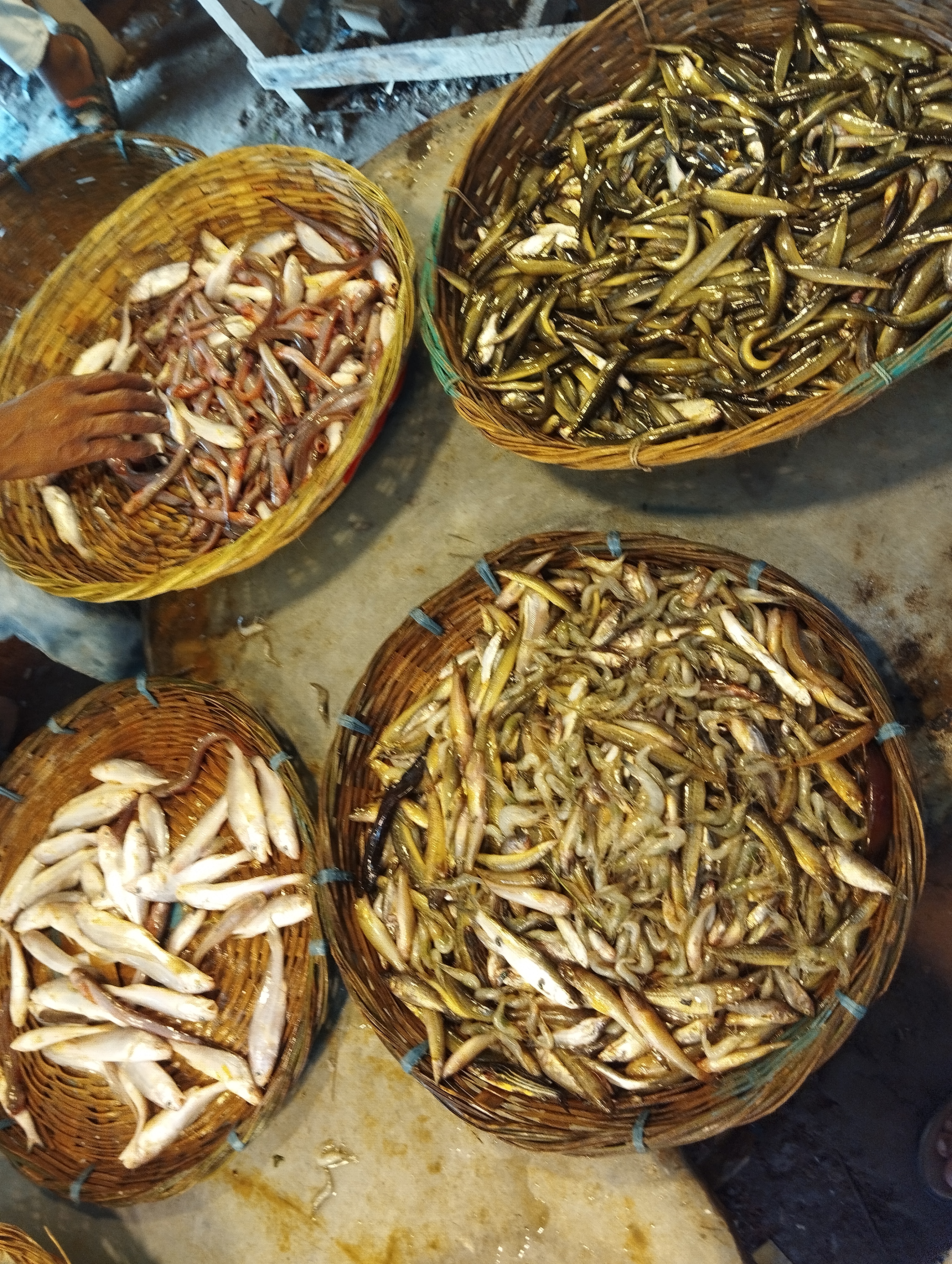 তারপর আমরা গিয়েছিলাম বিভিন্ন ধরনের ছোট মাছ কেনার জন্য। আসলে পাঁচমিশালি মাছ গুলো দেখে অনেক ভালো লেগেছিল। তবে এক ডালি মাছ নিম্ন চার হাজারের নিচে নয়। তারপর কি আর করা বেশ কিছু সময় বাজার ঘুরে ঘুরে দেখলাম। আসলে মাছ দেখলেই আনতে ইচ্ছে করে তবে দামের জন্য আর মাছ ও বেশি। তাই আমি আর একটু দেখতে লাগলাম। যাইহোক অবশেষে একটা ডালি মাছ পছন্দ হলো।তার ভিতরে রয়েছে পাবদা, চিংড়ি, বেলে,টেংরা, রিটা, বাইম মাছ আর অনেক কিছু। তাই আমি সেগুলো কিনব।তবে তারা ১০০০ টাকার নিচে কেজি দেবে না। তবে কি আর করা এখন মাছ পছন্দ হয়েছে তাই সব কিনবে।