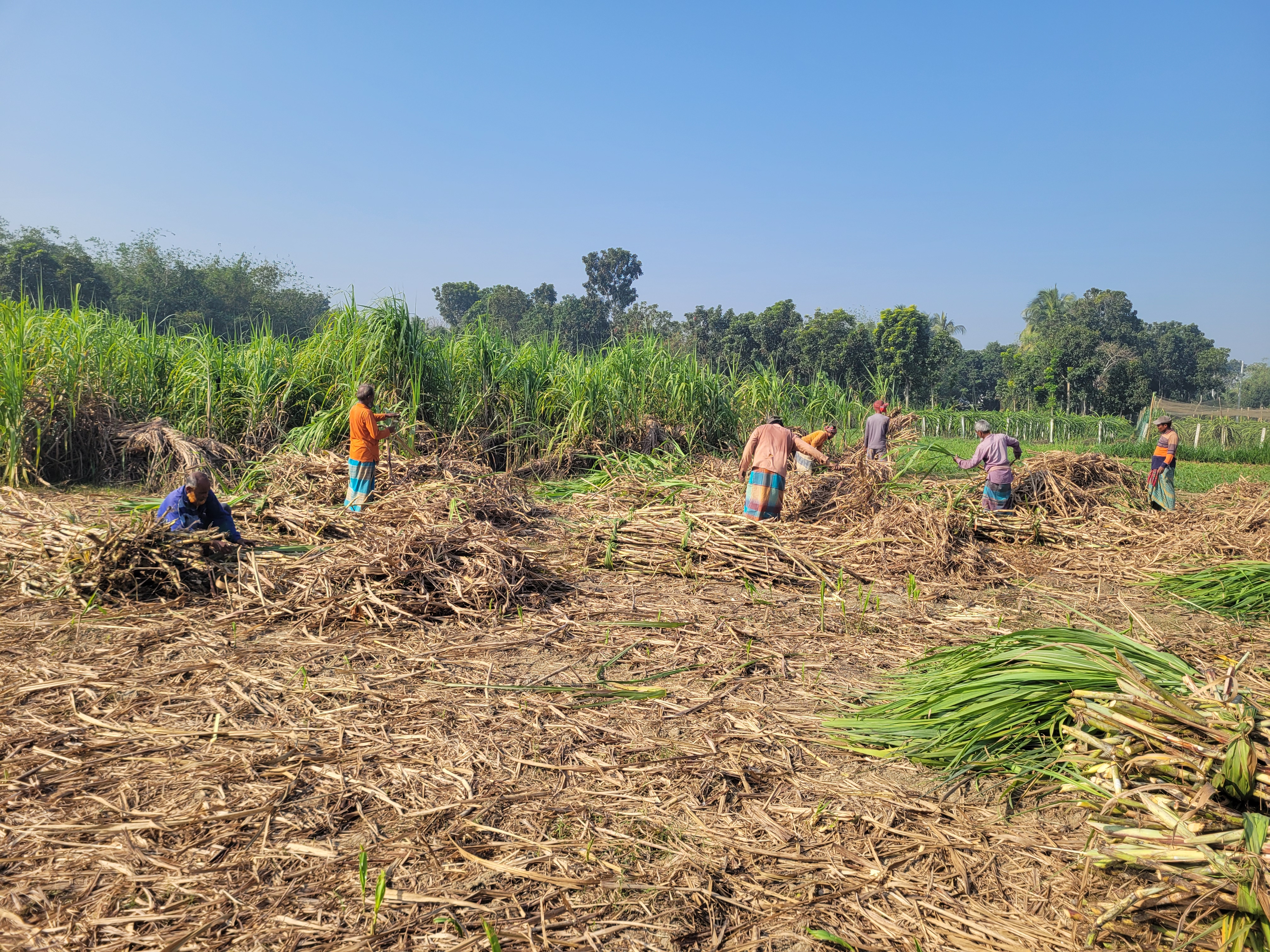 আজ সকালে মাঠ দেখতে গিয়ে চাচার এই আখ ক্ষেতে গিয়েছিলাম। গিয়ে দেখলাম মোটামুটি প্রায় ১০ থেকে ১২ জন শ্রমিক নিয়ে আখ কাটা হচ্ছে। সেখান থেকে আমি একটি সুন্দর আঁখ নিয়ে খেলাম। অনেক সুমিষ্ট আখ। সবাই আখ কান্ড কাটাতে ব্যস্ত। আখের কাণ্ডই মূলত এখানে প্রধান বস্তু। আর উপরের যে পাতার অংশ ওটি গরু বা ছাগলের খাবার হিসেবে ব্যবহার হয়। বাংলাদেশের যত চিনি এবং আখের গুড় তৈরি হয় তার প্রধান যোগানদাতাই হচ্ছে এই মাঠে চাষ করা আখ। এবং এই আখ বাংলাদেশের কৃষি ক্ষেত্রে অনেক ভালো ভূমিকা পালন করে।