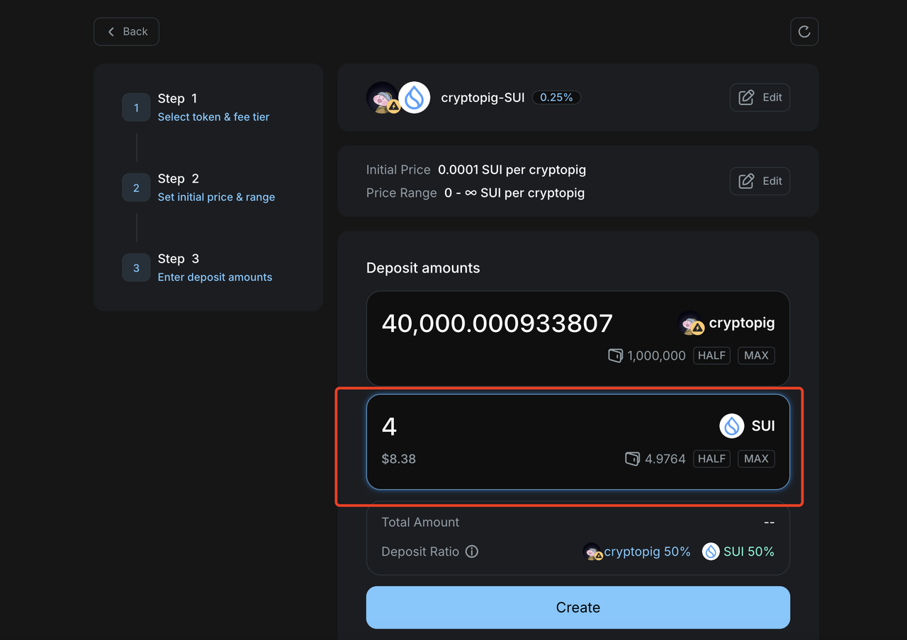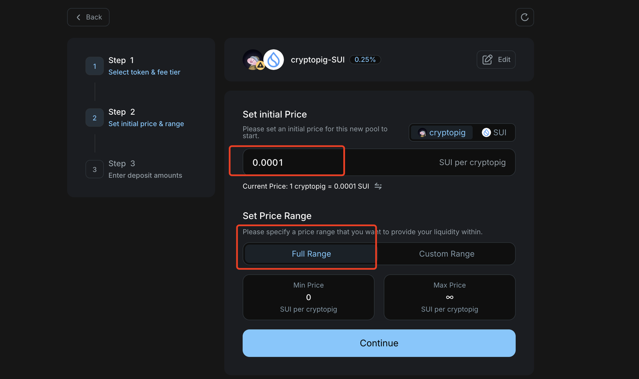 之后,我们填写要加池子的金额。例如,我选择加4个SUI,交易所会自动给我配对4w个左右的Cryptopig,确认数量后,点击continue按钮即可