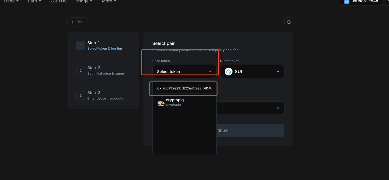 点击后弹出来一个弹窗,我们按步骤来,先点击左侧的token 选择按钮,然后把我们合约代币地址输入进来,右侧我们这边默认选择sui代币作为价格锚定代币,你也可以选择usdc或者其他代币。