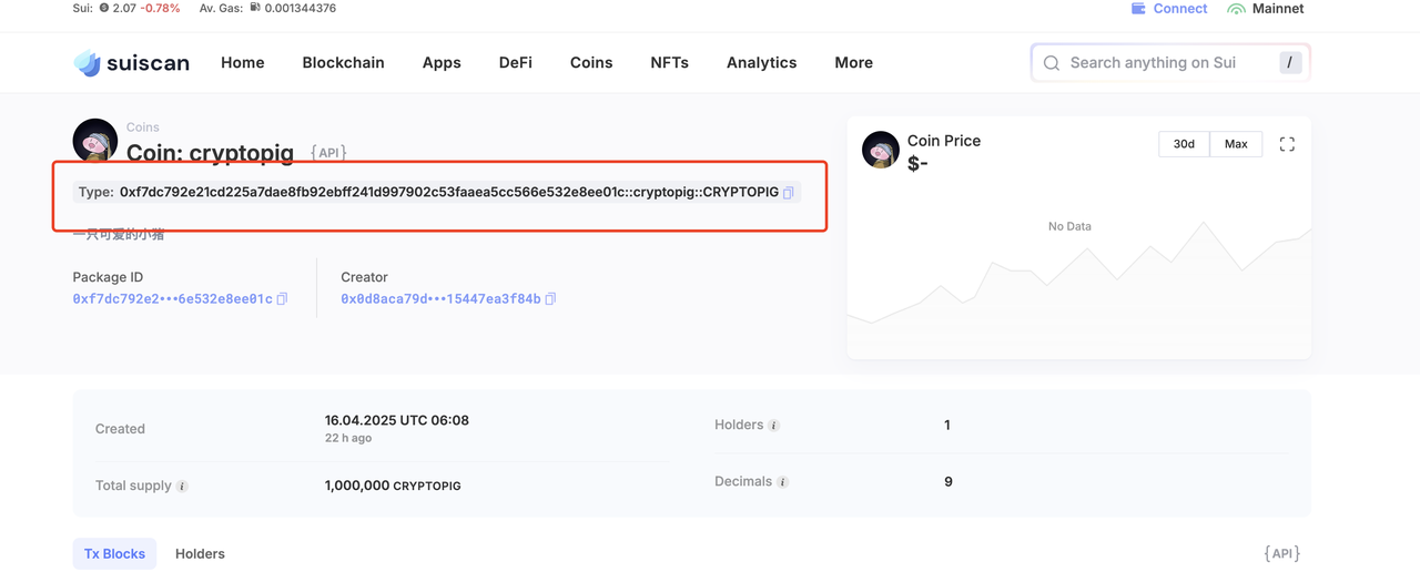 需要注意的是,这里填写代币的合约地址是不行的,还需要把代币类型的后缀带上,我们要复制suiscan上type这一栏的代币地址