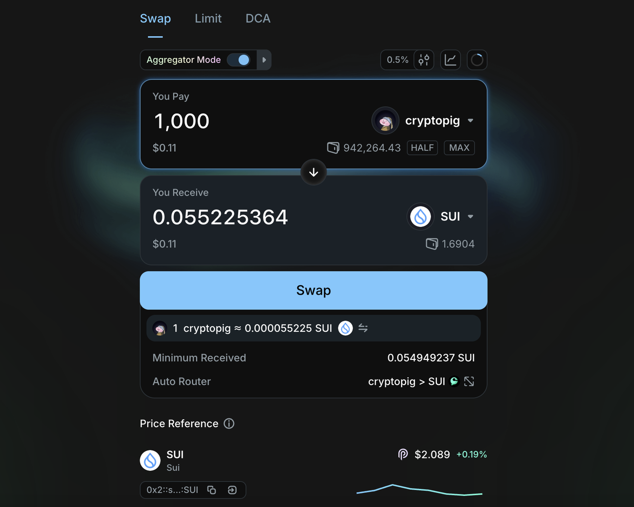 流动性池创建完成之后,就可以进行交易测试了,点击菜单栏上方的swap,我们就能够看到能够开始交易了,现在因为资金池里面sui的数量比较小,代币会有很大的价差。