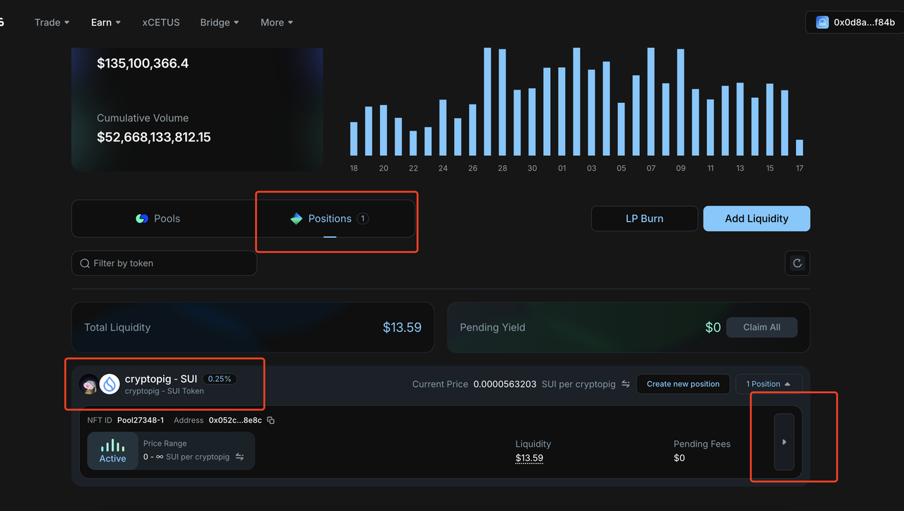 池子创建成功后,接下来我们看怎么增加流动性与撤出流动性,即所谓的:加池子与撤池子。回到pools页面,点击中间position,就可以看到我们的流行性池了。再点击最右侧进入详情页面