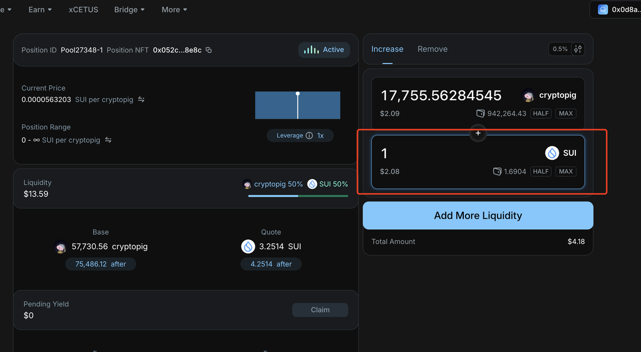 进入流动性池详情页面后,我们就能在右侧看到我们加池子和撤池子功能了,只要输入相应的sui数量,就会同比例的把token数量加入进池子,如果需要撤池子,就点击上面的额Remove