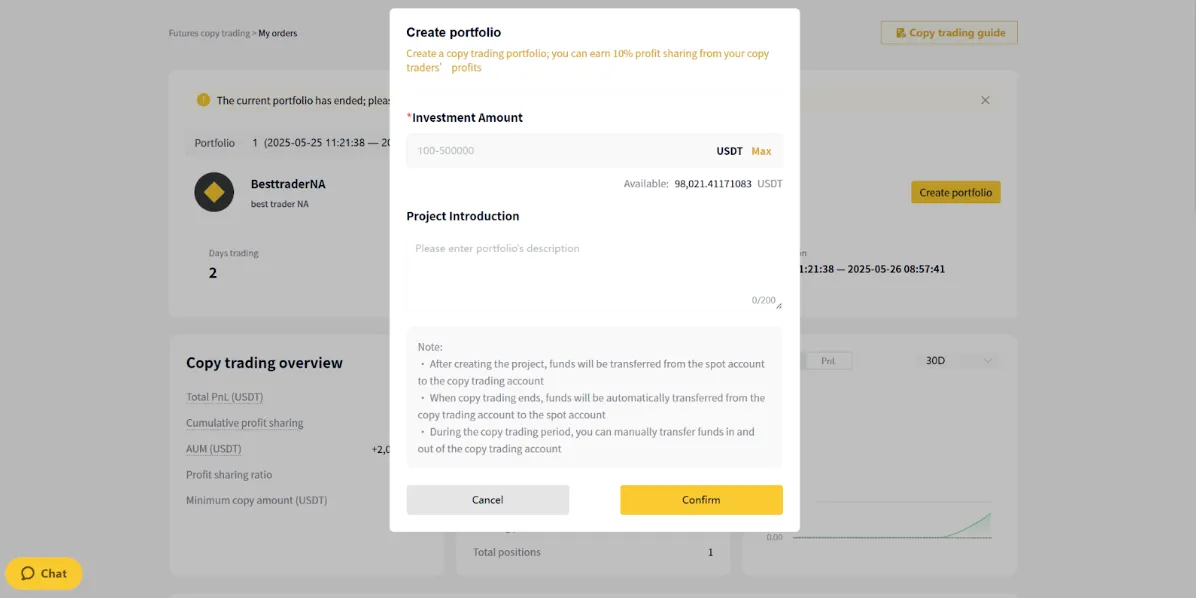 After creating a project, funds will be transferred from your spot account to your lead trader account.