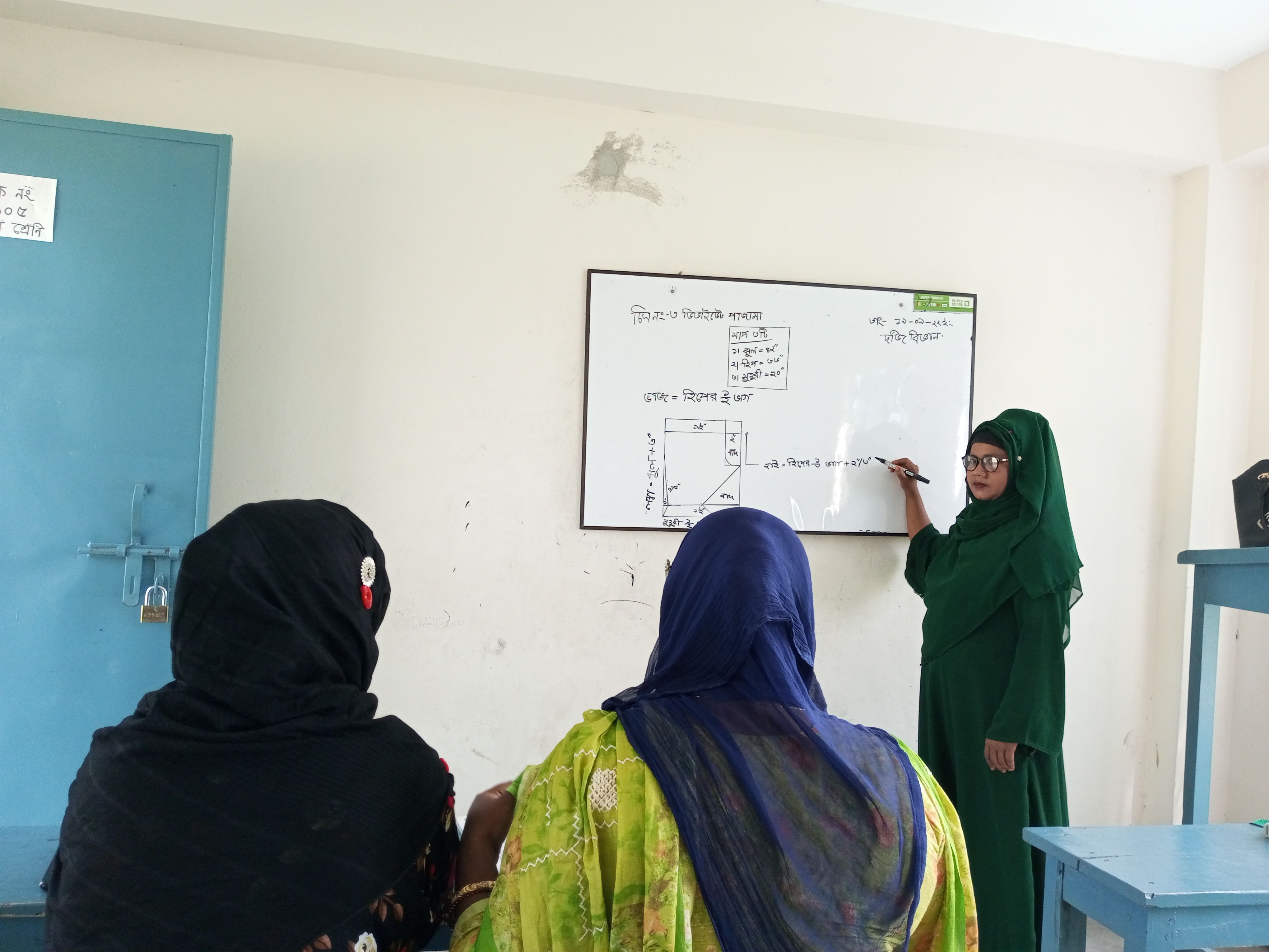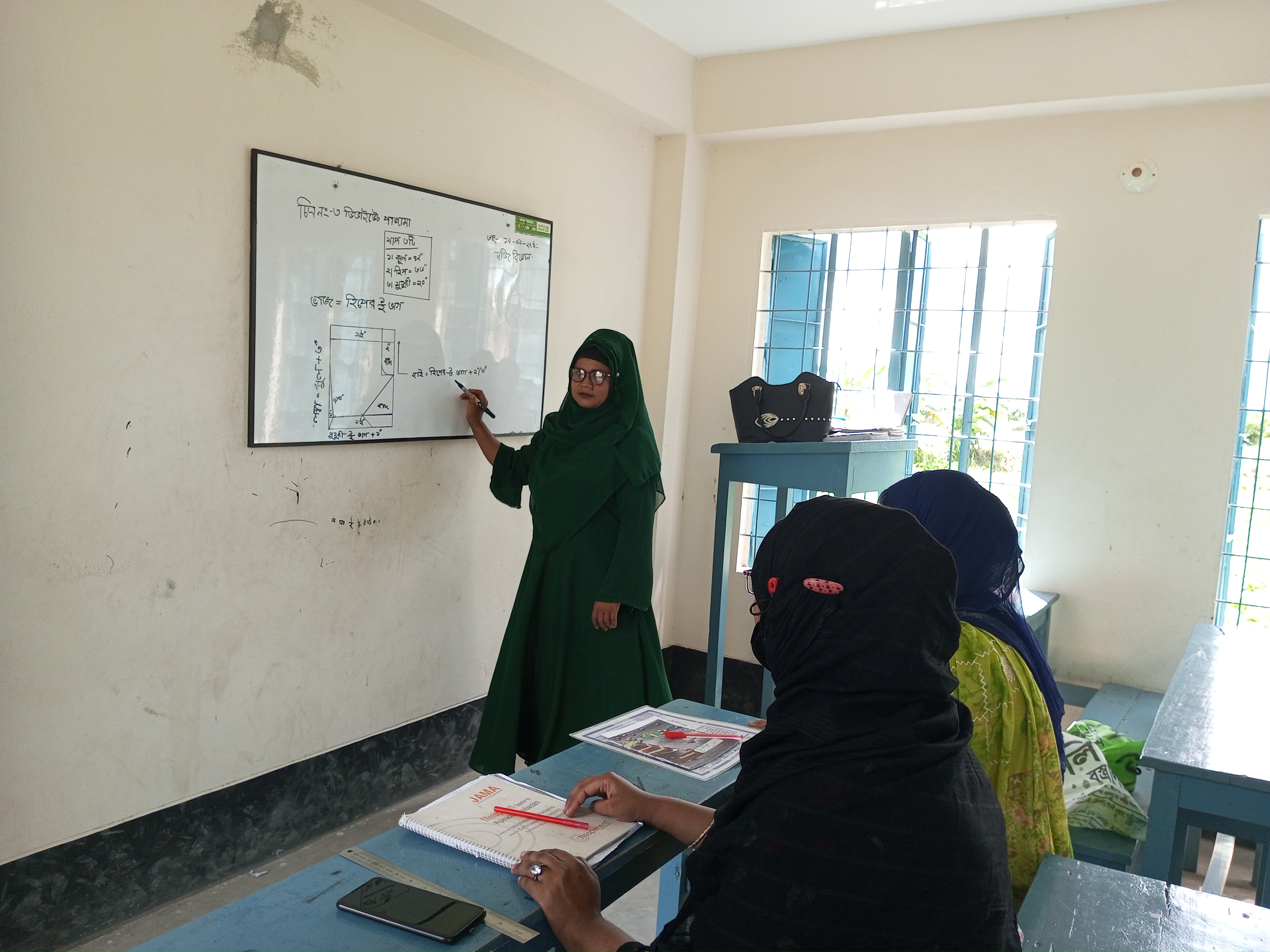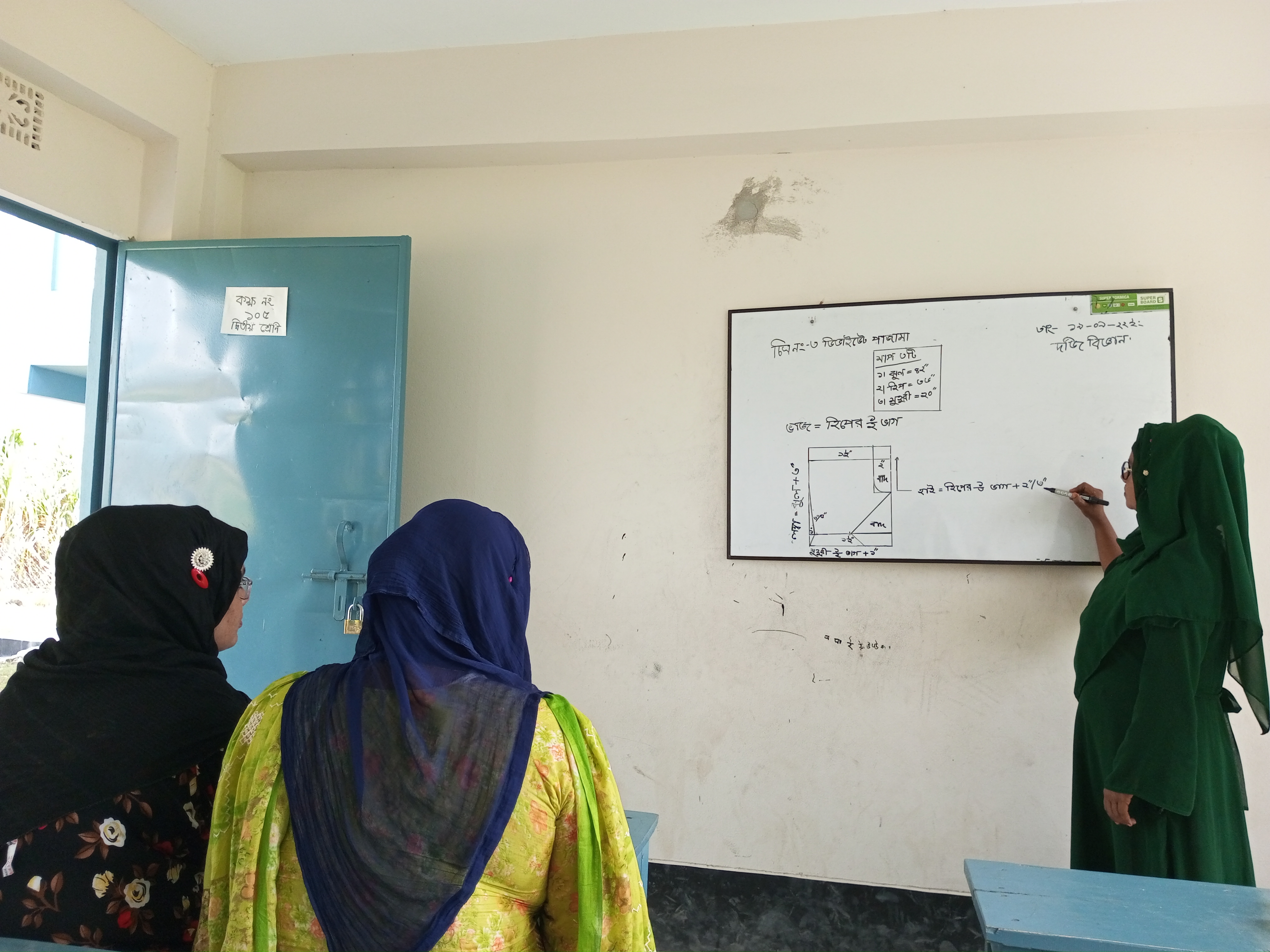 আমি কিছুটা সময় ধরে ফটোগ্রাফি করেছিলাম আর ক্লাস নেওয়ার ধরণ টা দেখছিলাম। অবশ্য তখন ক্লাসে মাত্র দুইজন ছাত্রী উপস্থিত ছিলেন,বাকিরা সব পাশের রুমে সিট কাটায় ব্যস্ত ছিল। উনাদের তো অনেক কিছু প্রশিক্ষণ থাকে অত কিছু আমার বোধগম্য নয়। তবে যেই রুমে তারা কাজ করছিল সেখানে আর ফটোগ্রাফি না করে শুধু ক্লাসেই উপস্থিত থাকলাম।