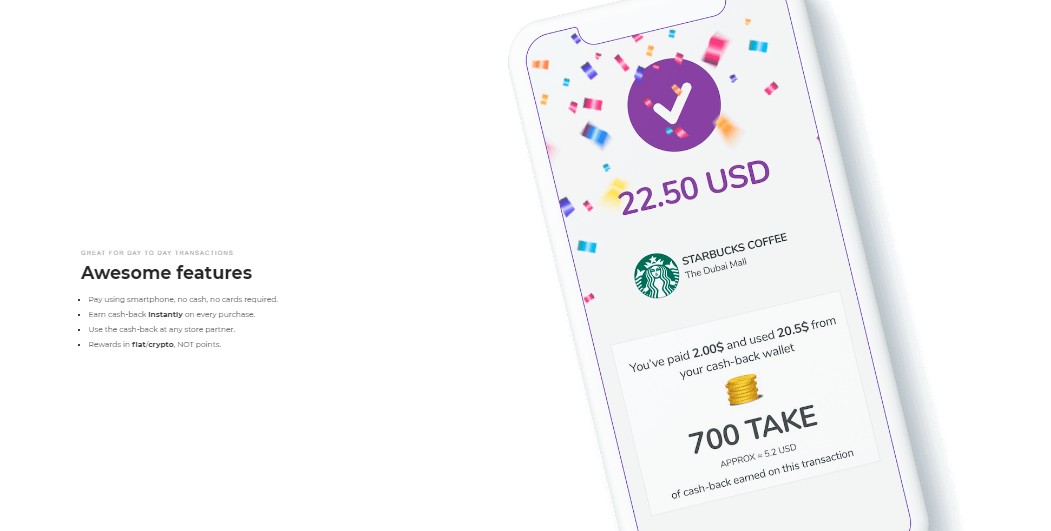 It is a payment aggregator via which users can pay using their bank cards, e-wallets, or crypto. In this process each payment at a store partner, users will get cash-back INSTANTLY (up to 60%, no maximum amount, no terms and conditions). Users can choose to get cash-back in fiat currency or takecoin; they can pay their next bill using the accumulated cash-back at any store partner. By this, the user gets a wide experience of having a good amount of Cashback. Using it will give users reworked and many offers collaborating with individual shops and businesses.