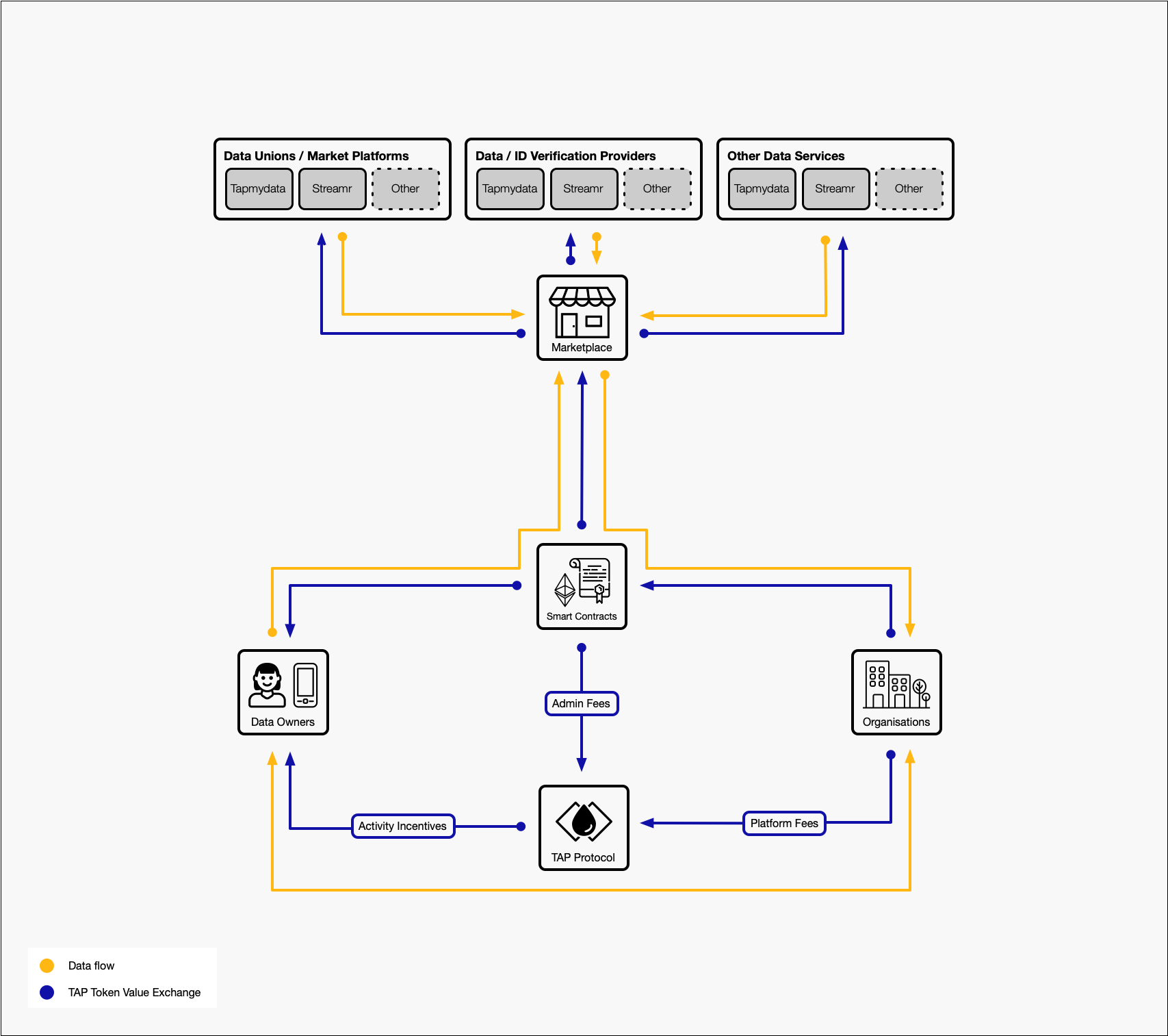 They are huge problems around data value, privacy and security are rooted in the original design of digital market. Our decentralized TAP personal protocol and tokens breaks the old circle of data abuse. Each user can manage their own digital identity, Non-Fungible Tokens (NFT) of blockchains verified consent and license this for use across the web, receiving value (ERC20 tokens) from organisations.