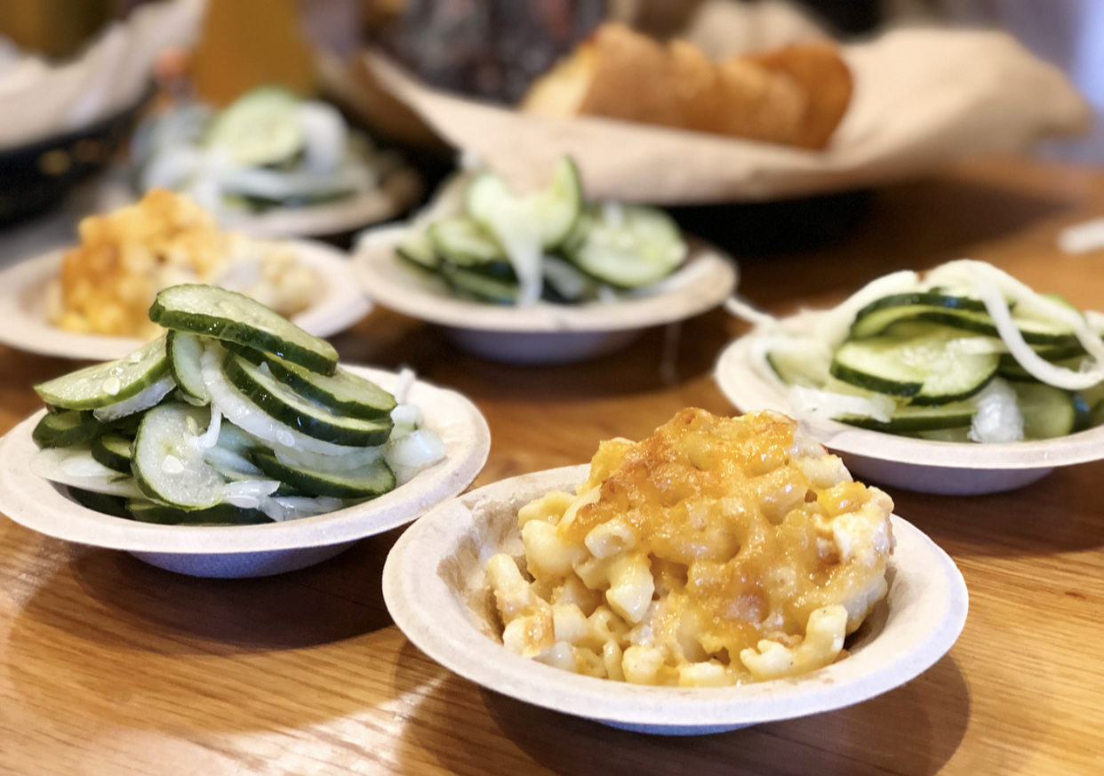 그럼 어마어마한 크기의 갈빗대가 6-8개 나오고, side 2개를 같이 고를 수 있는데 주로 mac & cheese, cuke and onion salad를 시킨다.