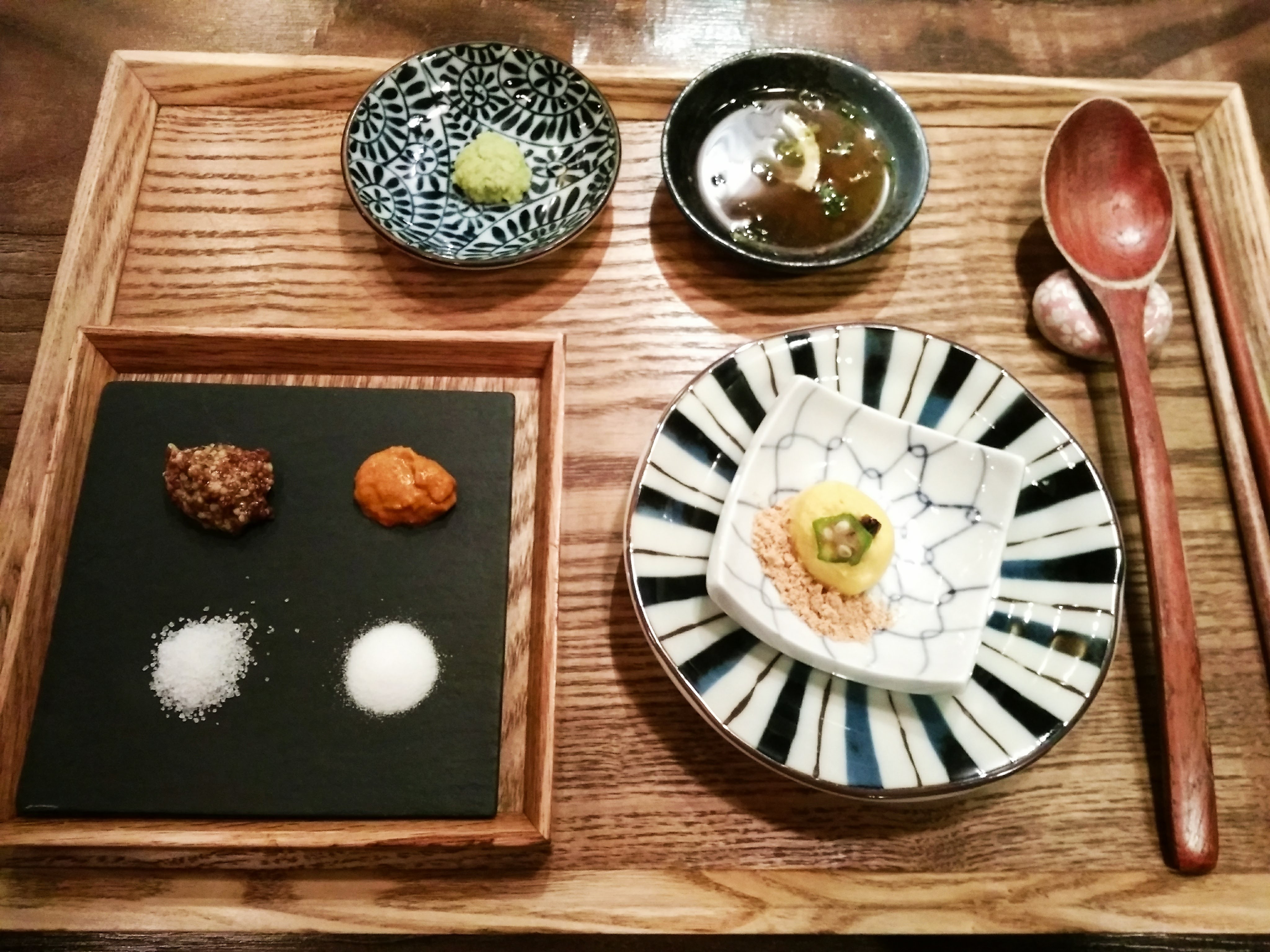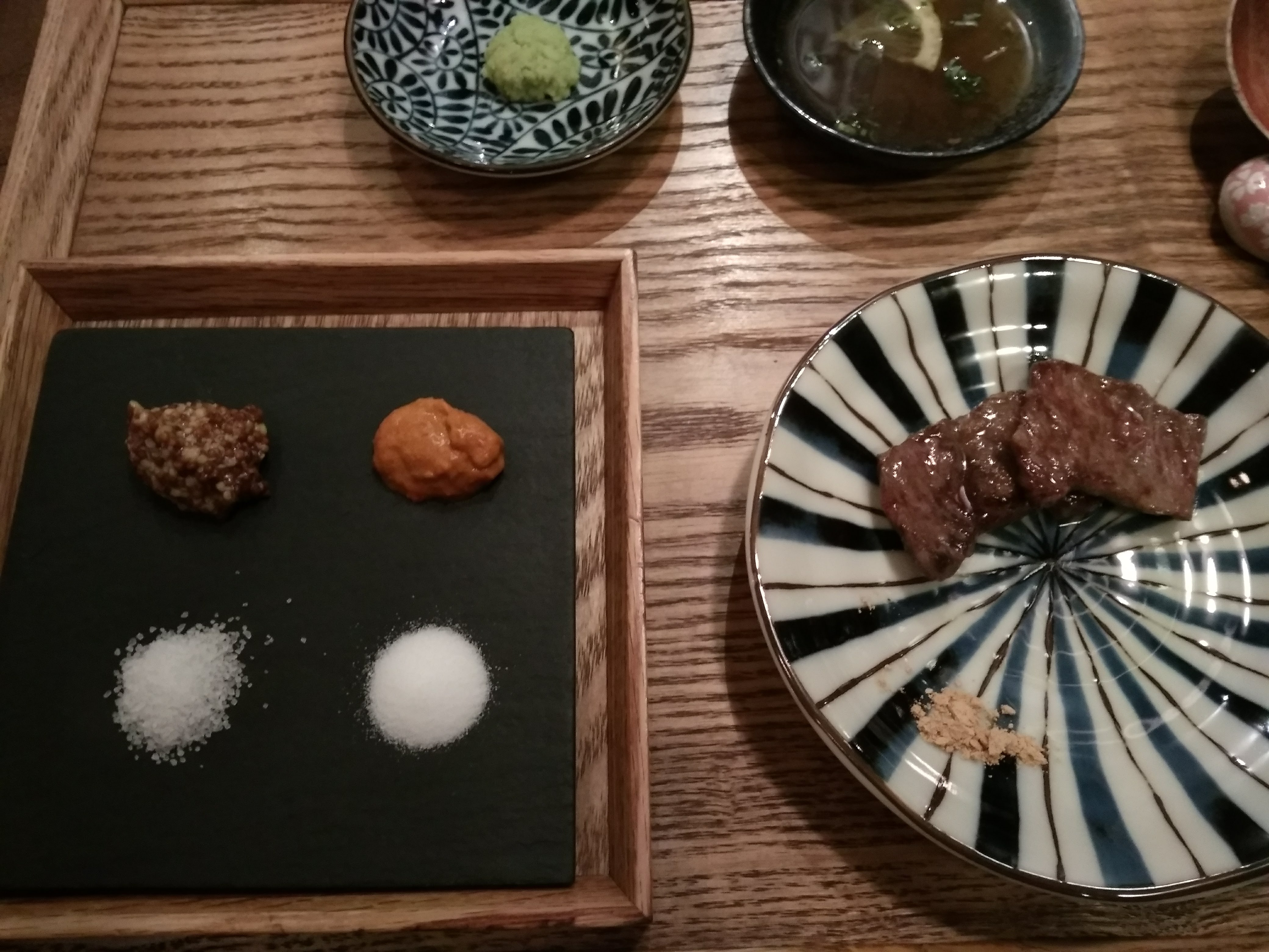 소고기님 영접할 생각에 기대 뿜뿜 하면서 기다리니 모찌리도후,양념장과 소금을 예쁘게 플레이팅 해서 가져다 주셨네요, 그릇도 깜찍하고 예뻐라!