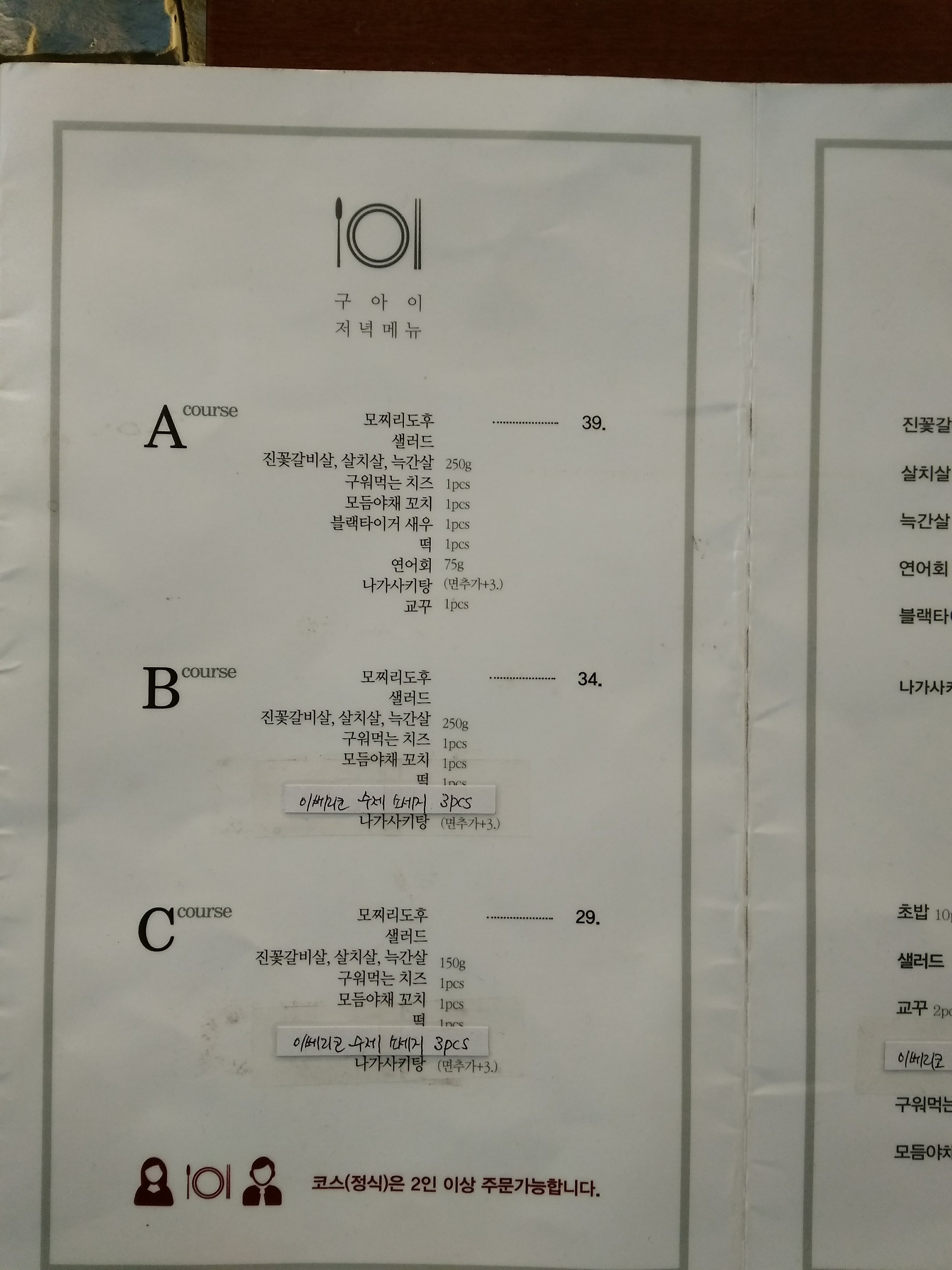 참고로 C코스와 B코스는 고기의 중량에서 차이가 있을 뿐 구성메뉴는 똑같아요.