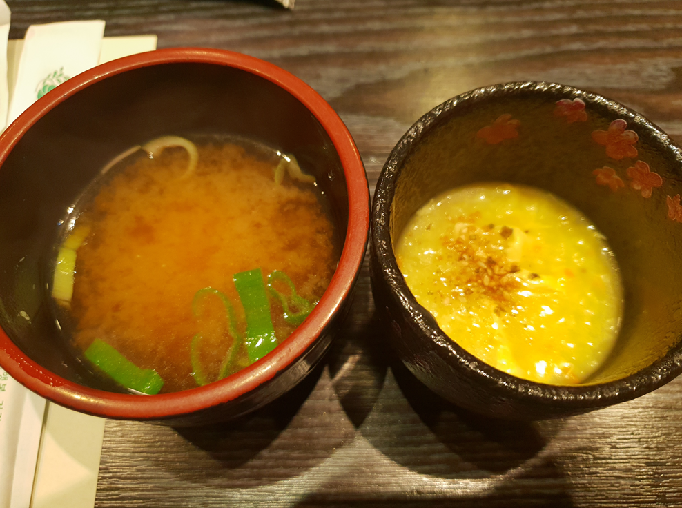 참치가 나오기 전 입맛을 돋궈주는 죽과 된장국입니다.