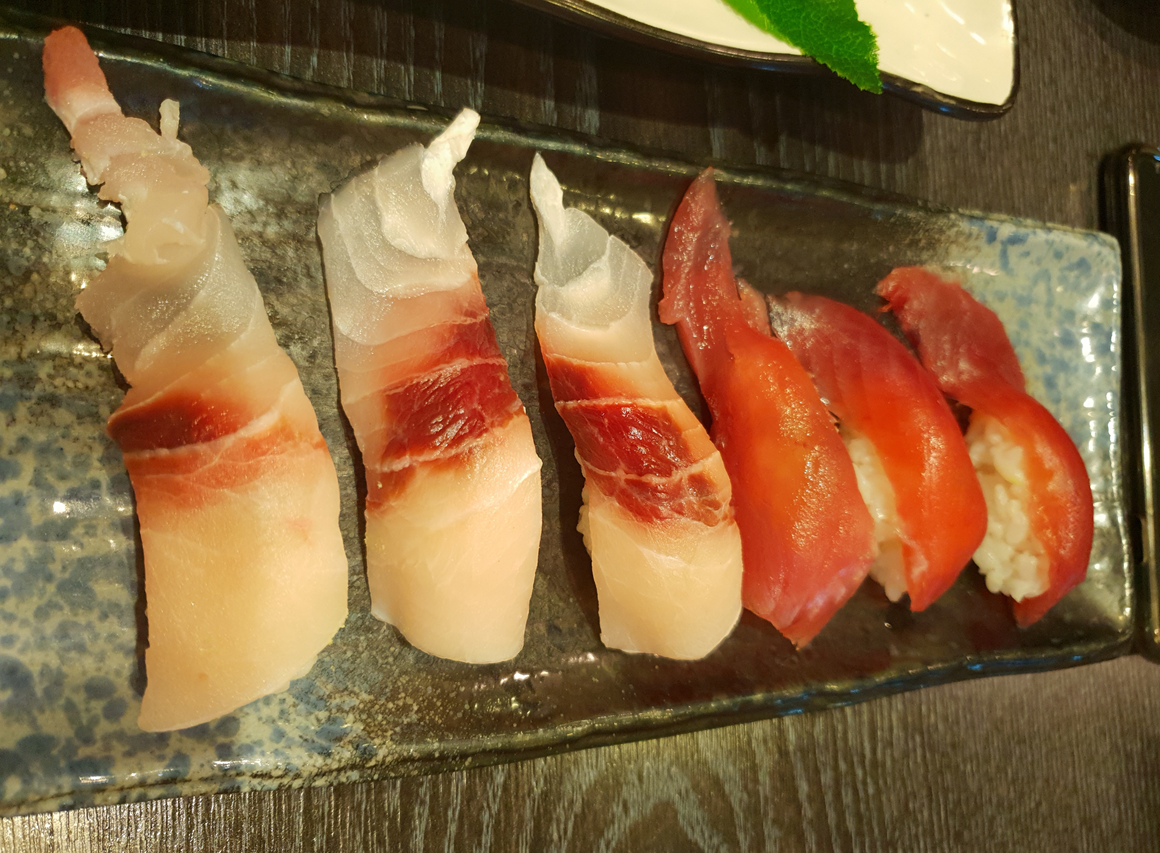 왼쪽 아래에 구운듯한 참치도 맛있고 위에 있는 금가루 발라진 붉은 참치부위도 정말 맛있었습니다.
