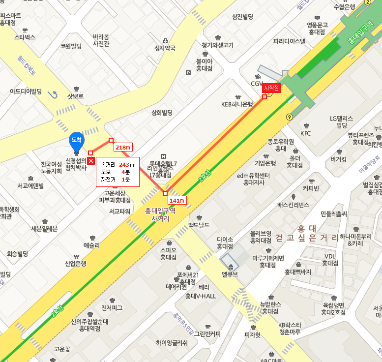 2호선 홍대입구역 1번출구에서 약 250m 떨어져있습니다.