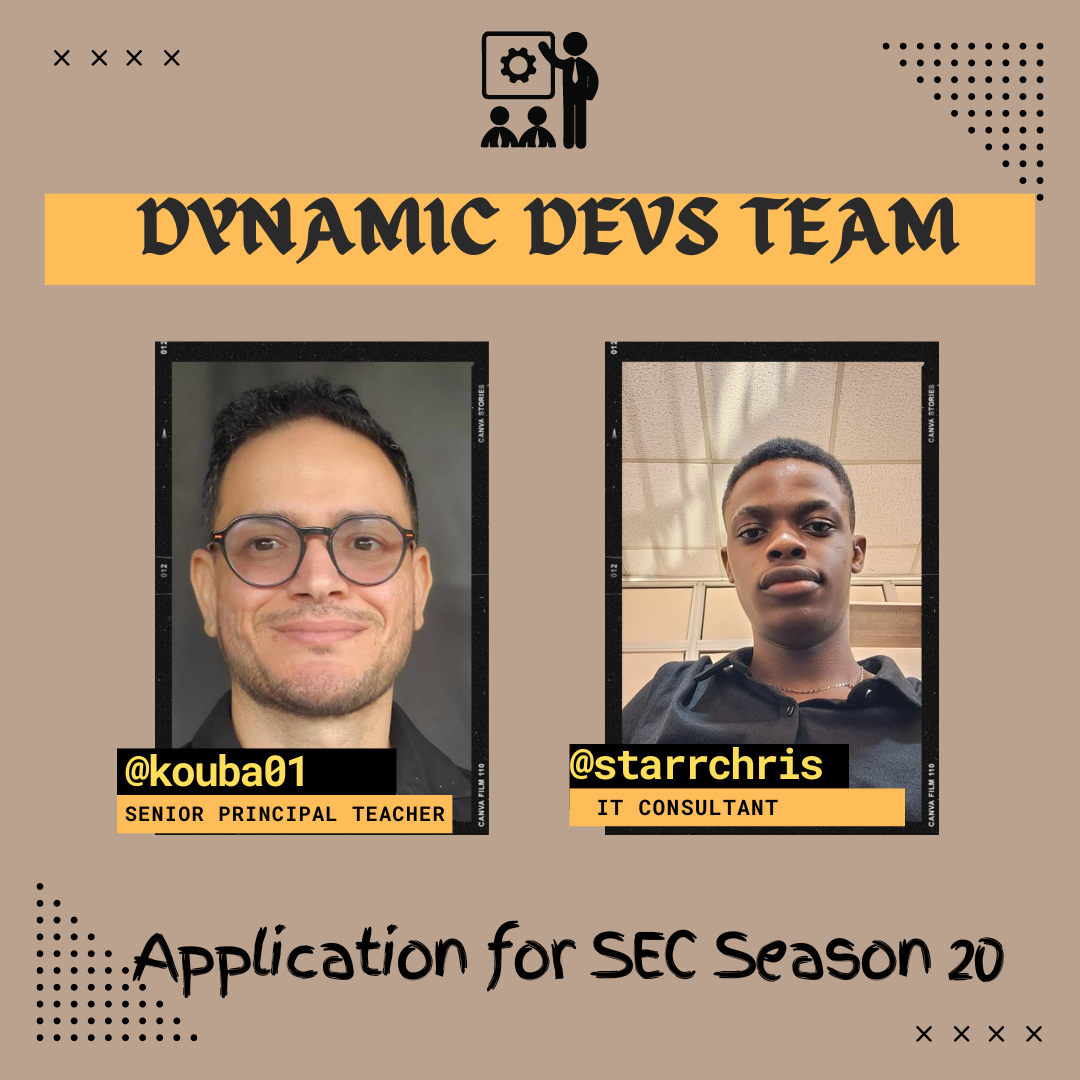 We are thrilled to submit our application to participate in the 20th season of the Steemit Engagement Challenge as a dedicated teaching team specializing in dynamic web development and database management. Our team, Dynamic Devs, is composed of two highly skilled and experienced members: Bilel Bouchamia and Nedu Nwafor. Over the past season, we have successfully guided participants through the intricacies of website interactivity using HTML, CSS, and JavaScript, ensuring they gained a solid foundation in front-end web development. This success has inspired us to continue building on our achievements and push the boundaries further in the upcoming season.