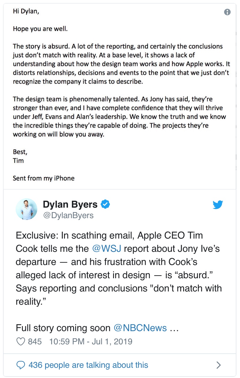 A day after an in-depth report describing Jony Ive’s cooling departure from Apple and the degrading nature of the design team at Apple, Cook made the rare move of responding directly to the report in an email sent to a reporter at NBC.