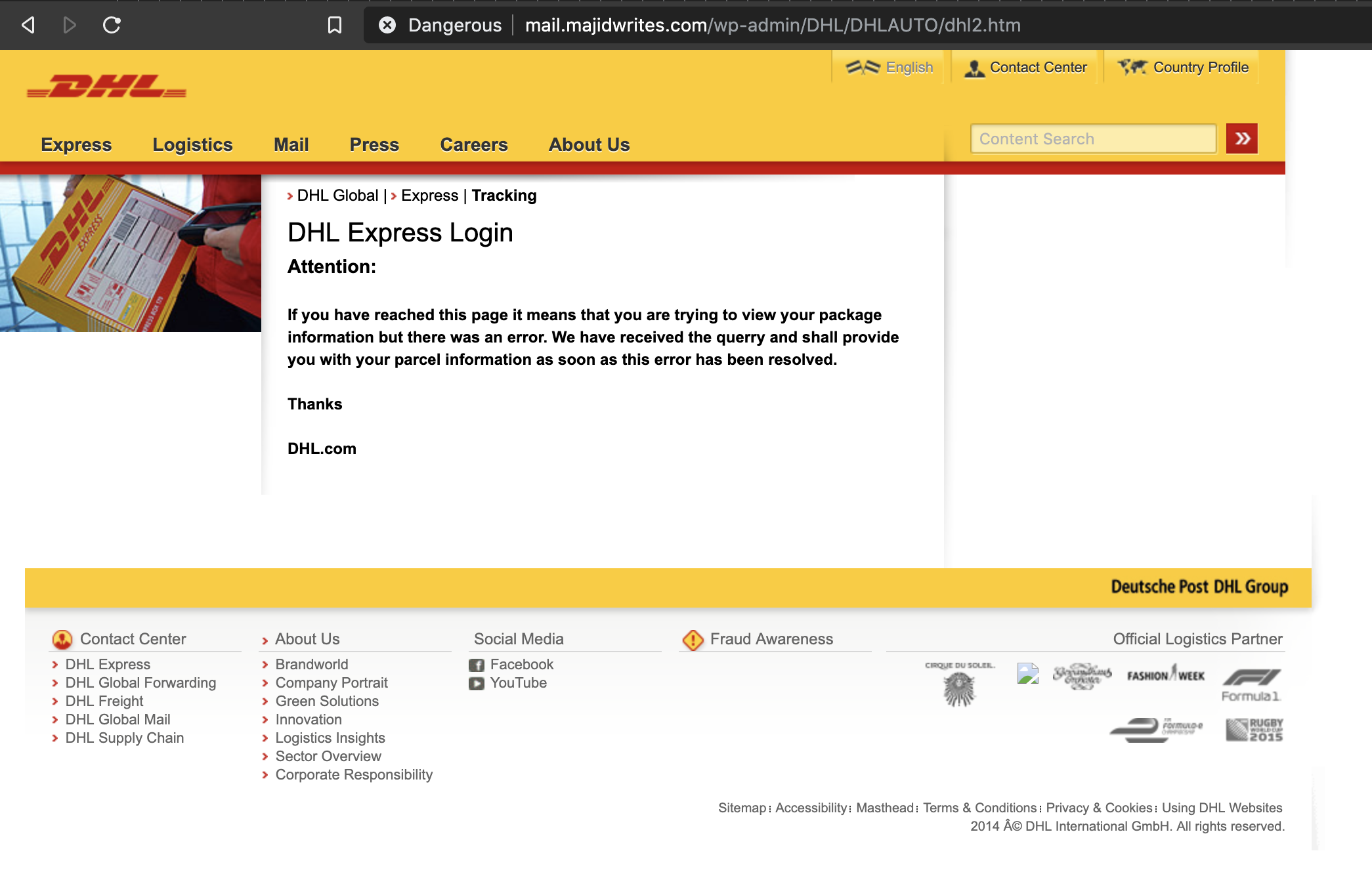 When we fill in our password and continue, we get bounced to this generic looking DHL error page, followed by a redirect a few seconds later to the real DHL website.