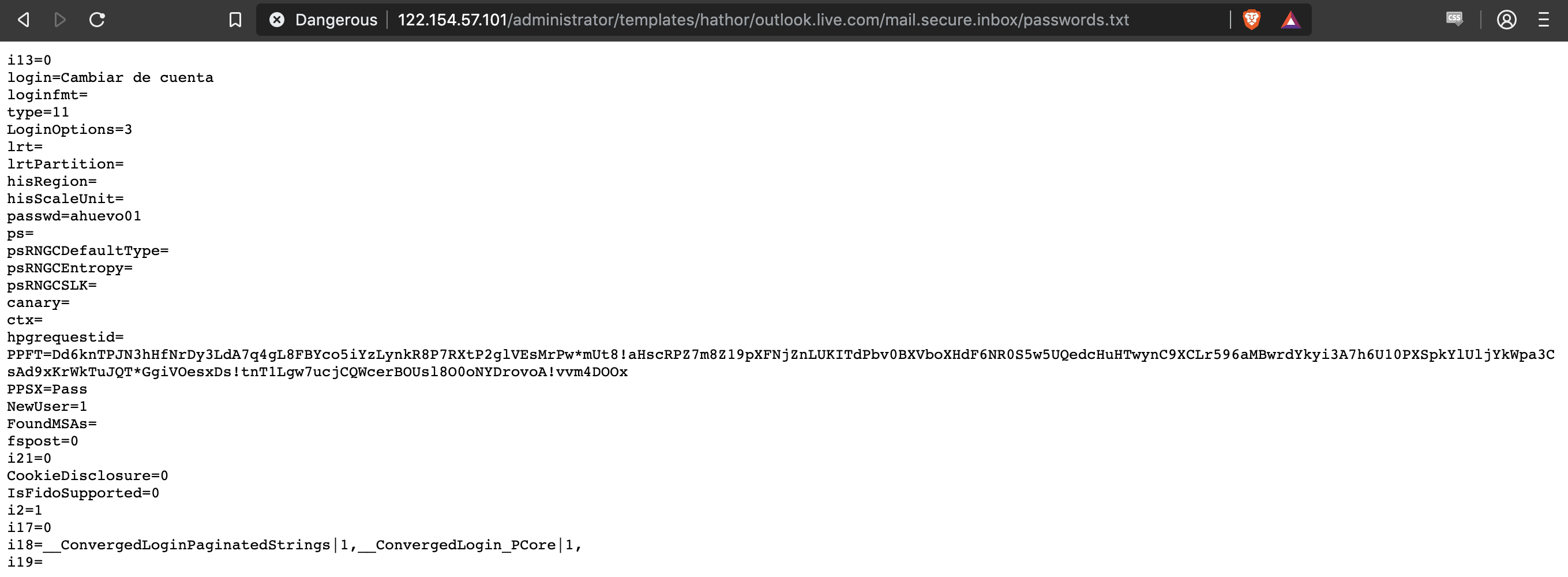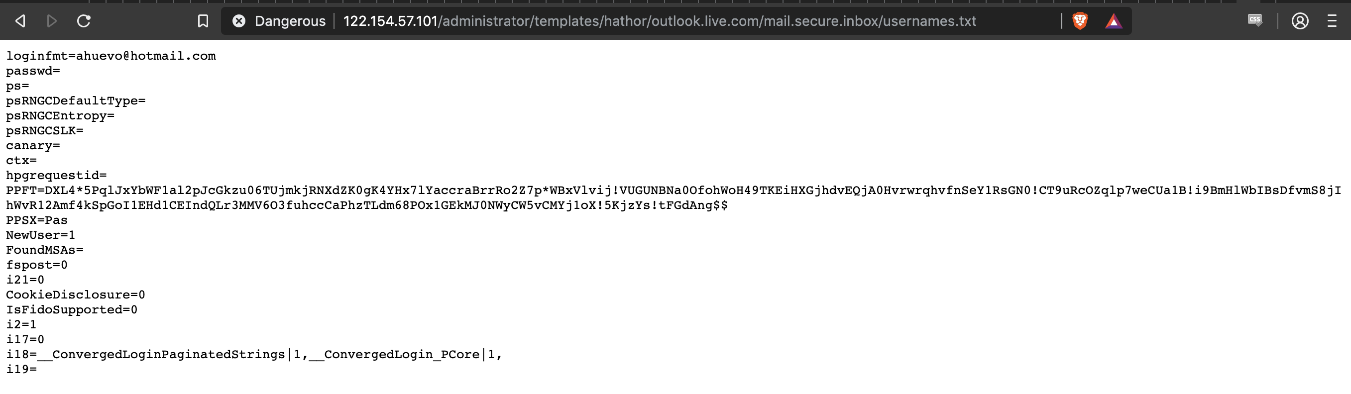 We also decided to try retrieve the "usernames.txt" and "passwords.txt" files, which are shown below. Notice how much of a fucking mess they are? This would be really hard to parse, so I guess this is an early iteration of the phishing kit. We can probably expect to see more sophisticated efforts in future I suppose.