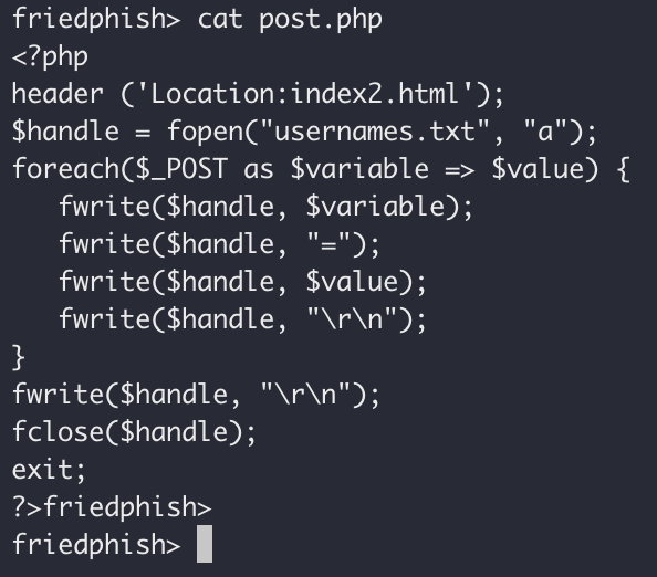 The post.php script does all the next bit of heavy lifting, as you can see in the screenshot below. What it effectively does, is dump all the form data into a file named "usernames.txt" and send a redirect to send the user over to "index2.html".
