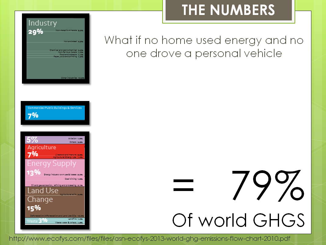 Getting rid of all car and home energy only reduces <30% of worldwide GHGs and leaves us with the environmental problems associated with garbage, poisonous ingredients, weak local economies and soil degradation.