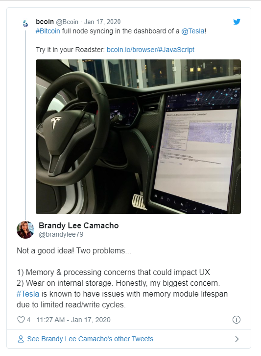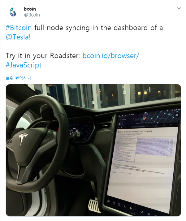 테슬라 자동차는 자율 주행, 자동 주차, 스마트 서모닝 등 많은 기능을 수행할 수 있다. 그런데 전기차 온보드 컴퓨터에서 비트코인 폴 노드를 운영하는 것은 어떻게 생각하는가? 최근 블록체인 프로젝트 비코인(bcoin) 의 트위터에서 테슬라 온보드 컴퓨터에서 비트코인 풀 노드를 작동하는 영상을 공유하였다.