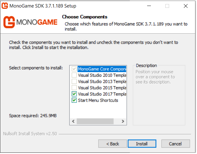 Make sure Visual Studio 2017 is selected, the click install. Once the setup is complete, you’re ready to start programming your first game with MonoGame!