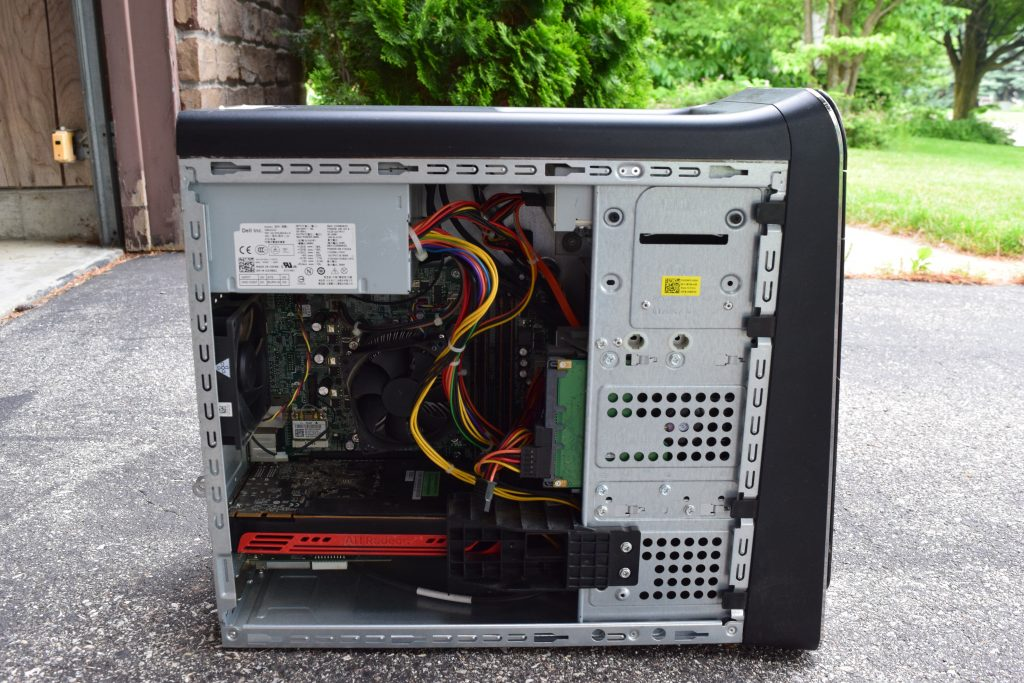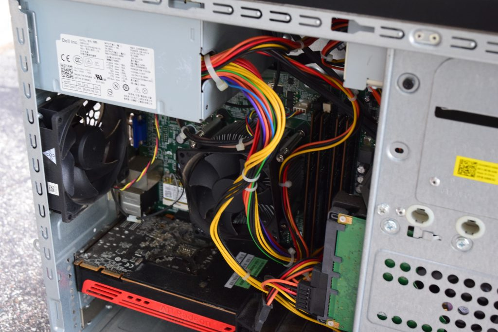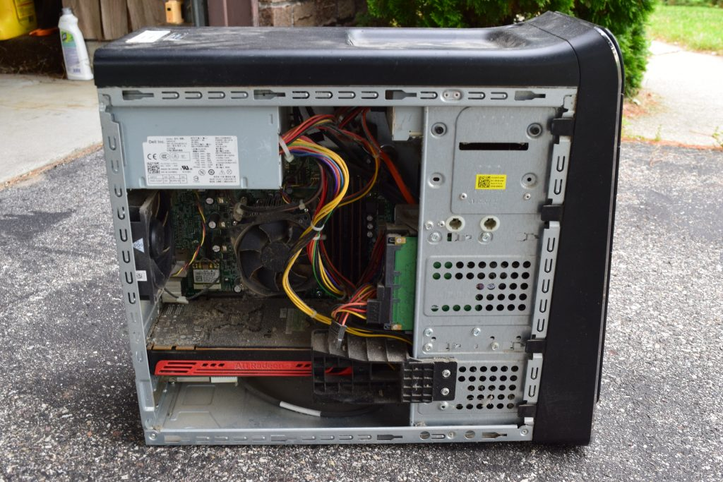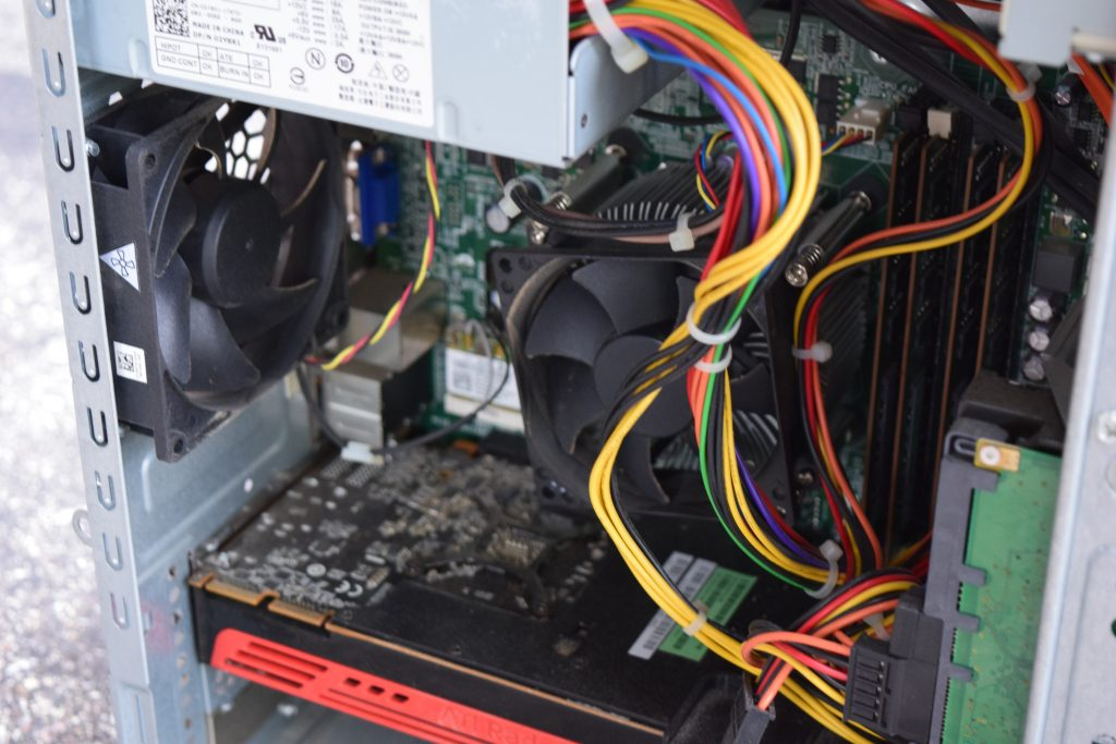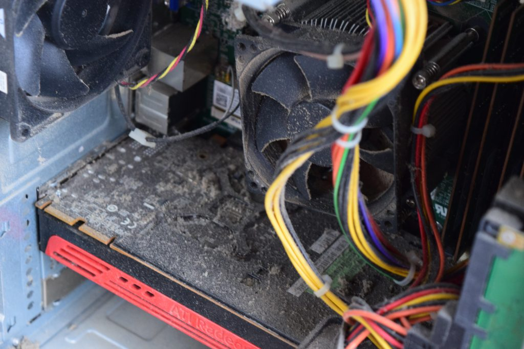It’s nearly July already! That’s hard to believe. Time flies… and so has the time since your computer was last cleaned out. I’m not talking just the cleaning of various files and folders to keep things tidy. No, I’m talking about the interior and exterior of your computer in the physical world. Dust build up can be a direct cause or a contributing factor for all kinds of issues! From insulating components from receiving proper airflow, to slowly building up in connectors and preventing components from connecting to the motherboard, dust can cause all sorts of these problems. Last week, a customer brought their computer to me. The problem was a failing drive. However, I couldn’t find this out at first because the computer was issuing a sequence of beeps at me and wouldn’t start. So I removed the video card, and reinstalled it. The problem with the computer not booting at first is because the video card couldn’t make a proper connection in the slot. This was because of dust buildup. So I used my electric leaf blower to remove all of the surface dust. Usually I find that ~80% of the dust in a computer is loose and on the surface, so it’s easy to remove. The other ~20% is caked on quite well and can’t be removed easily. Below are some before and after photos of before I cleaned the computer and after I cleaned it: