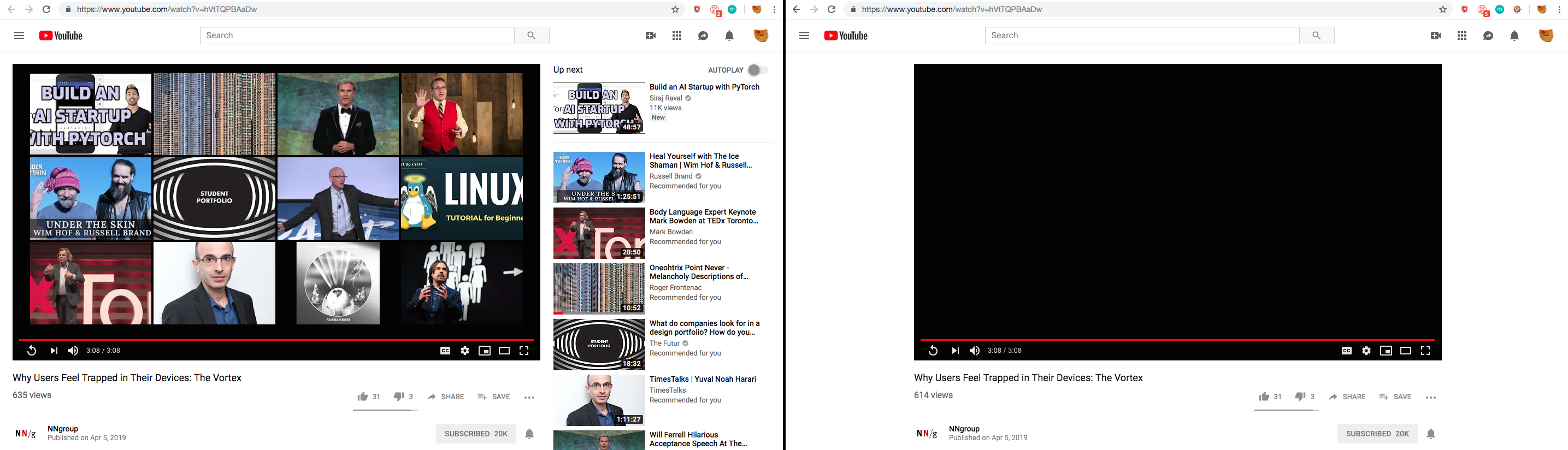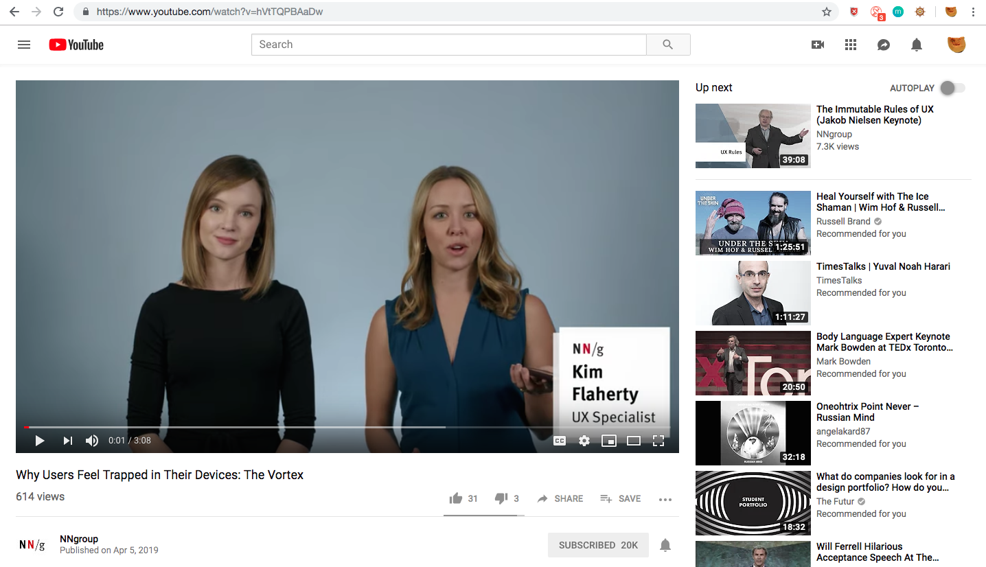 Those video “previews” on the right are like sticky fly-traps – they start to move if you point at them with cursor, but provide no actual information value. It's only a mental energy drain. What does that do to our brains, concentration and lives? Ask Google employees who work on Youtube, they know it very well.