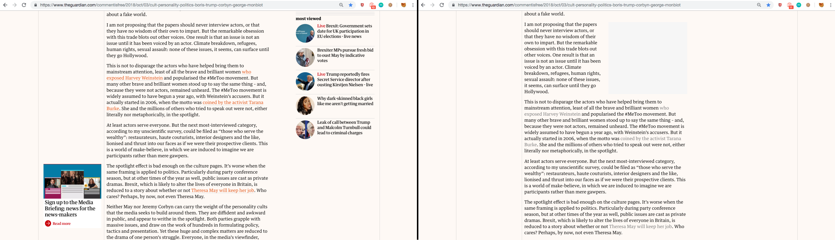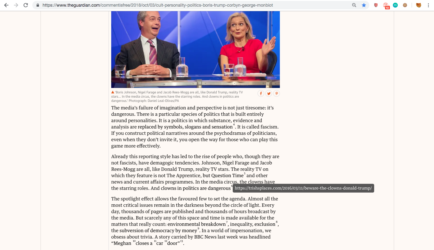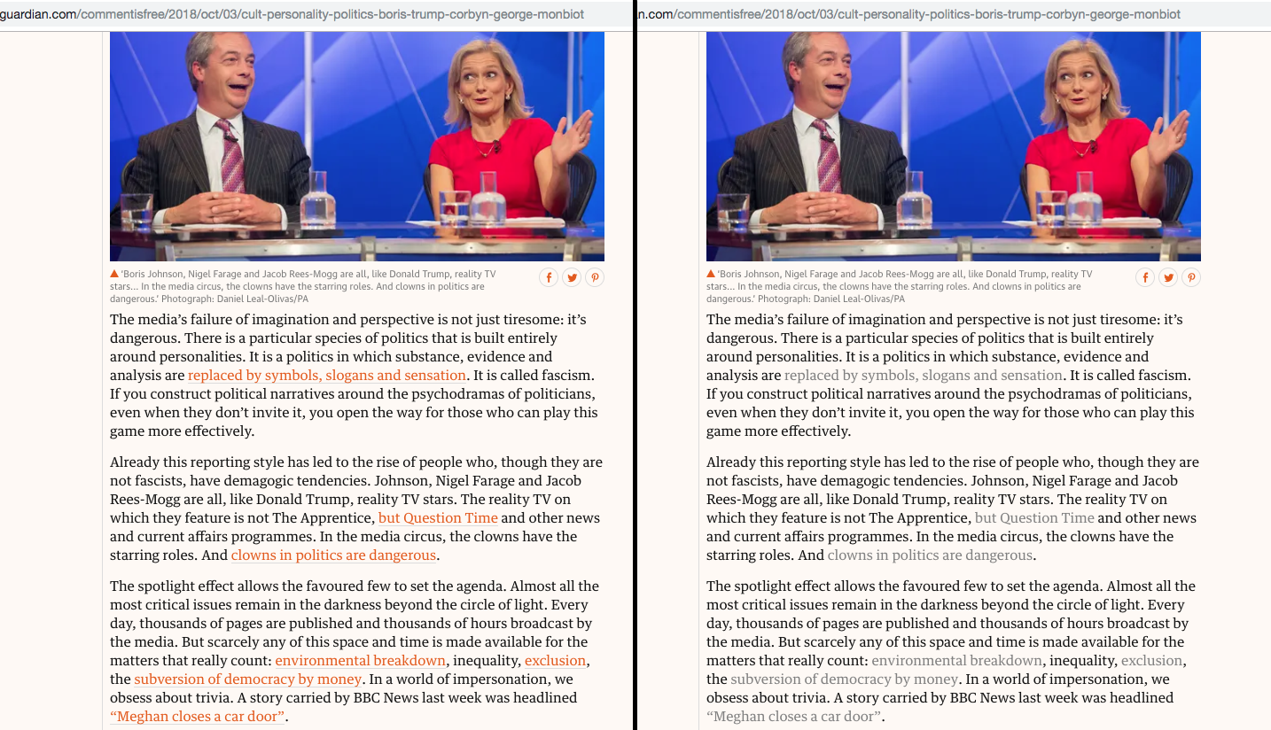 Another problem - related to problem of opening more tabs than I am able to process – happened because the links inside of articles' text are usually so visible. On Guardian, they are most often in very calling colors – red, orange, pink. I find that pretty extreme. On other sites, it might be other colors like green, blue, or they would have very visible underline but rarely would these links be somehow hidden.