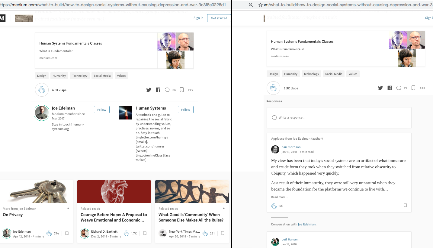 When you get to the end of articles, more recos are waiting for you there too, always, everywhere. Here's a screenshot comparison example of tidied-up experience on Medium.