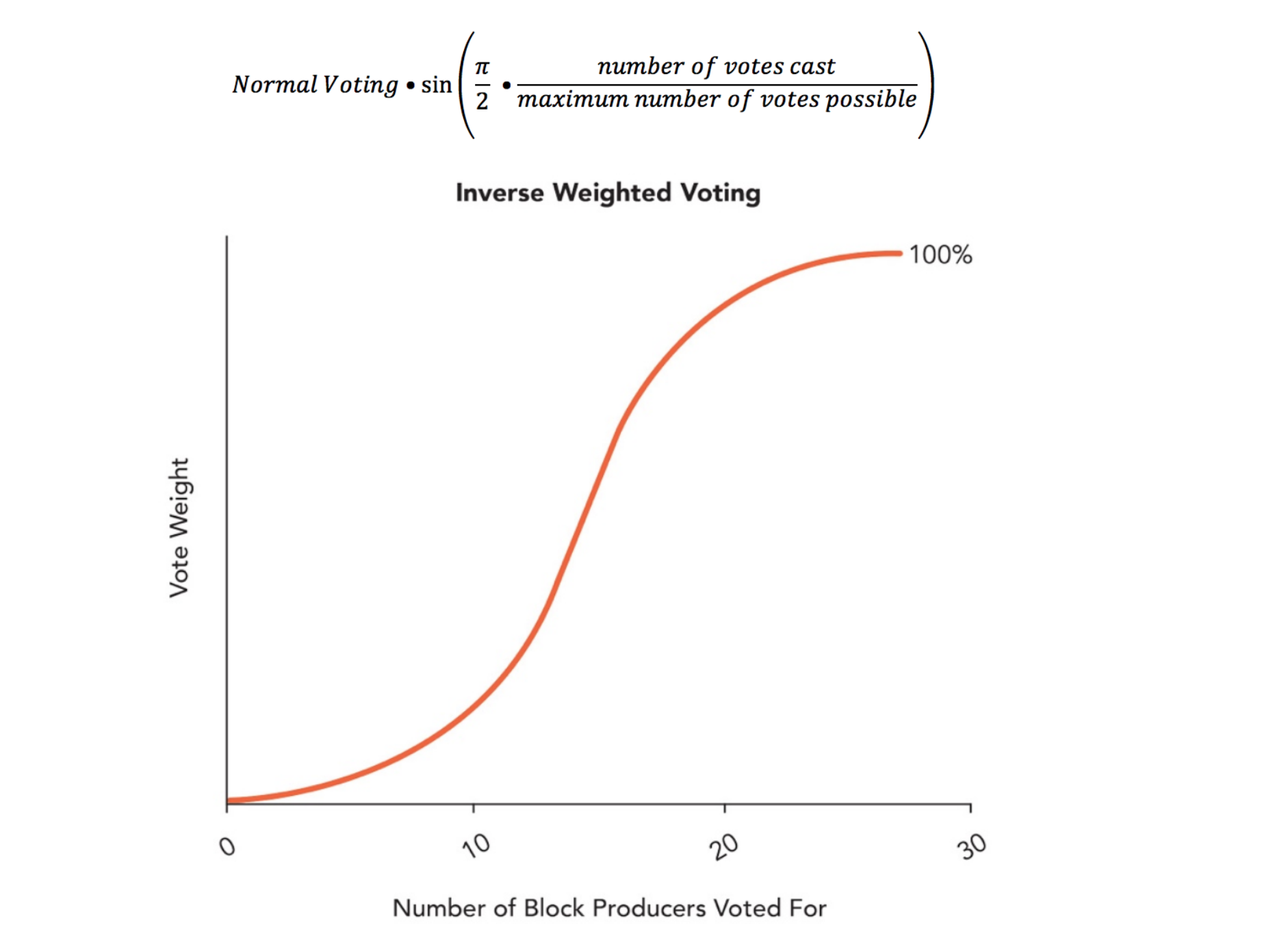 Telos的另一个特性是投票权重与投票数有关(反向权重)。Telos里每一票最多可以投给30个生产节点,当投票者的投票节点越少,其投票的权重力会被对应削弱。这保证了相对平均的投票分布,降低了新加入生产节点的门槛。