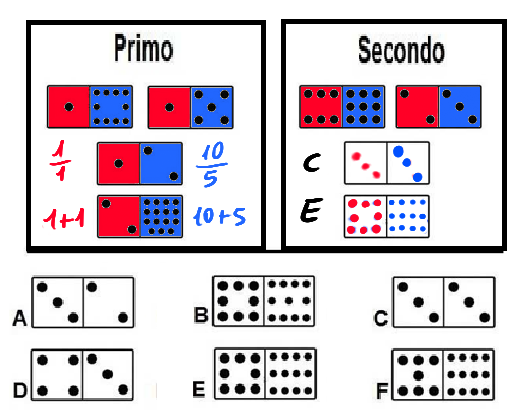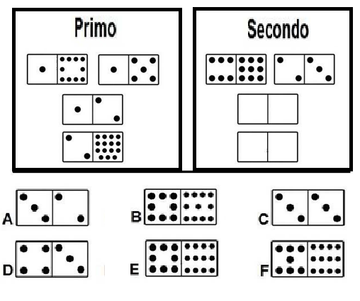 Il gioco consiste nell'inserire, al posto degli spazi vuoti, le pedine sotto proposte, a scelta tra (A,B,C,D,E,F); come da esempio nel primo gruppo.