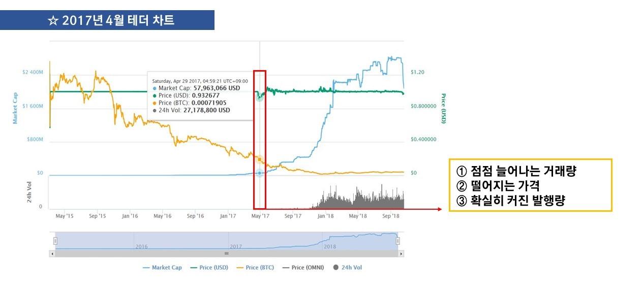 역사적 관적으로 분석한다면, 테더 가격이 떨어지면서 발행량이 커지고 거래량이 높아지면 비트코인의 가격은 곧 상승한다는 가설이 세워집니다.