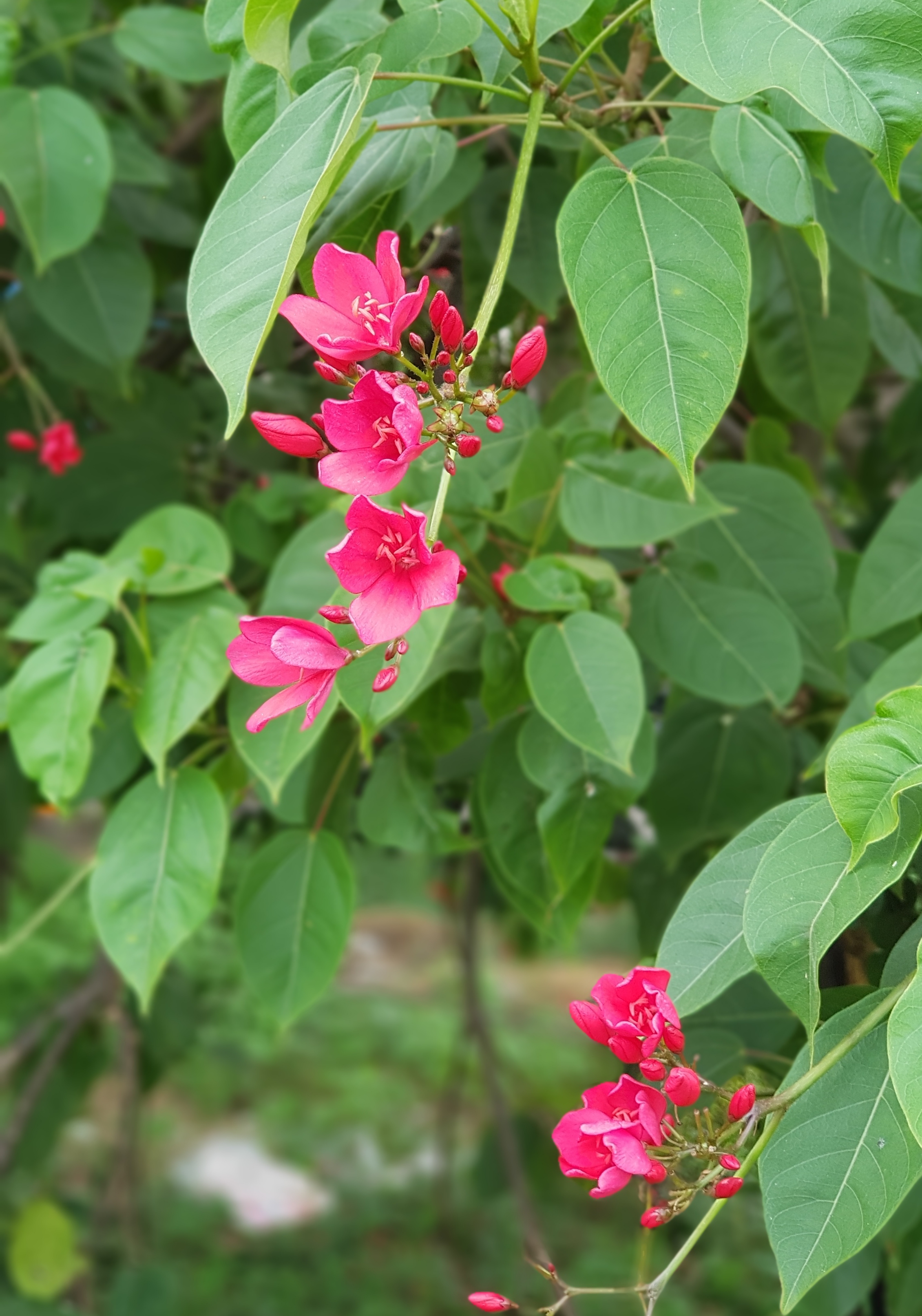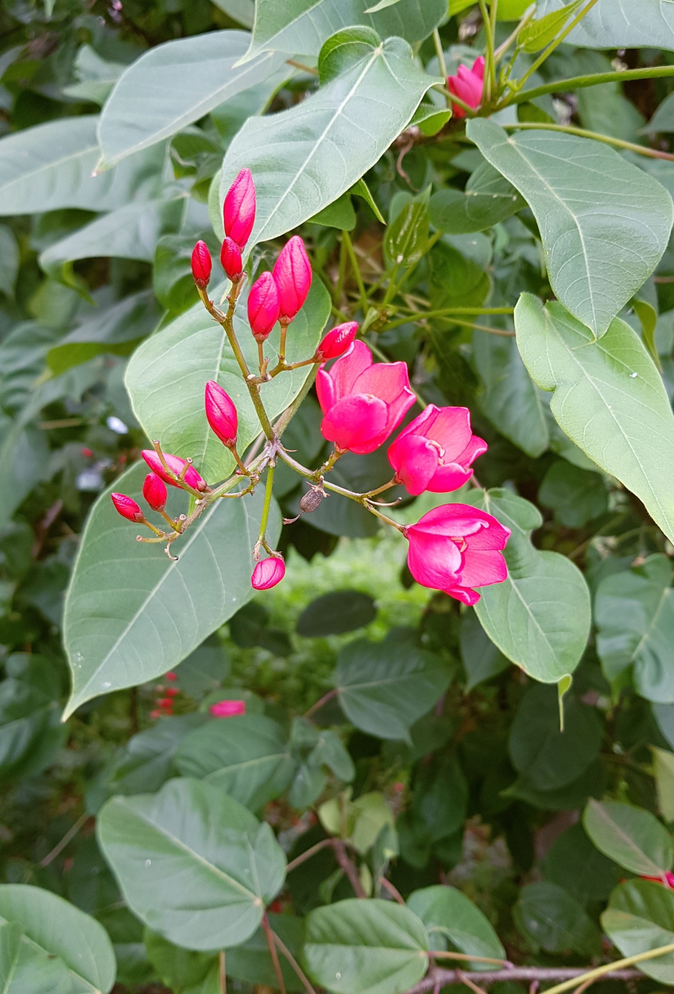 ลักษณะดอกมีสีแดง มีกลีบดอก5กลีบ ดอกตูมมีลักษณะเป็นวงรี ออกดอกเป็นช่อ