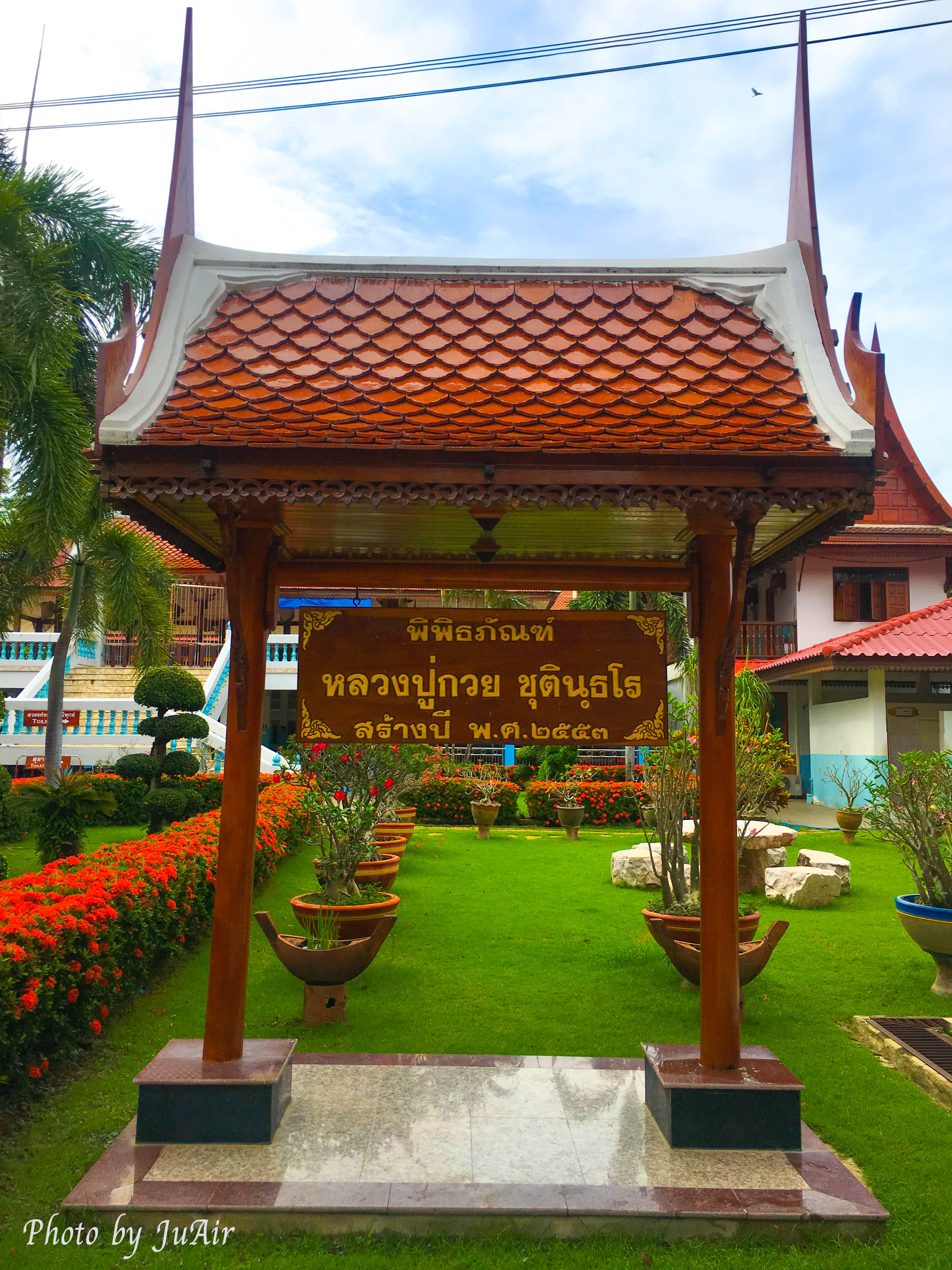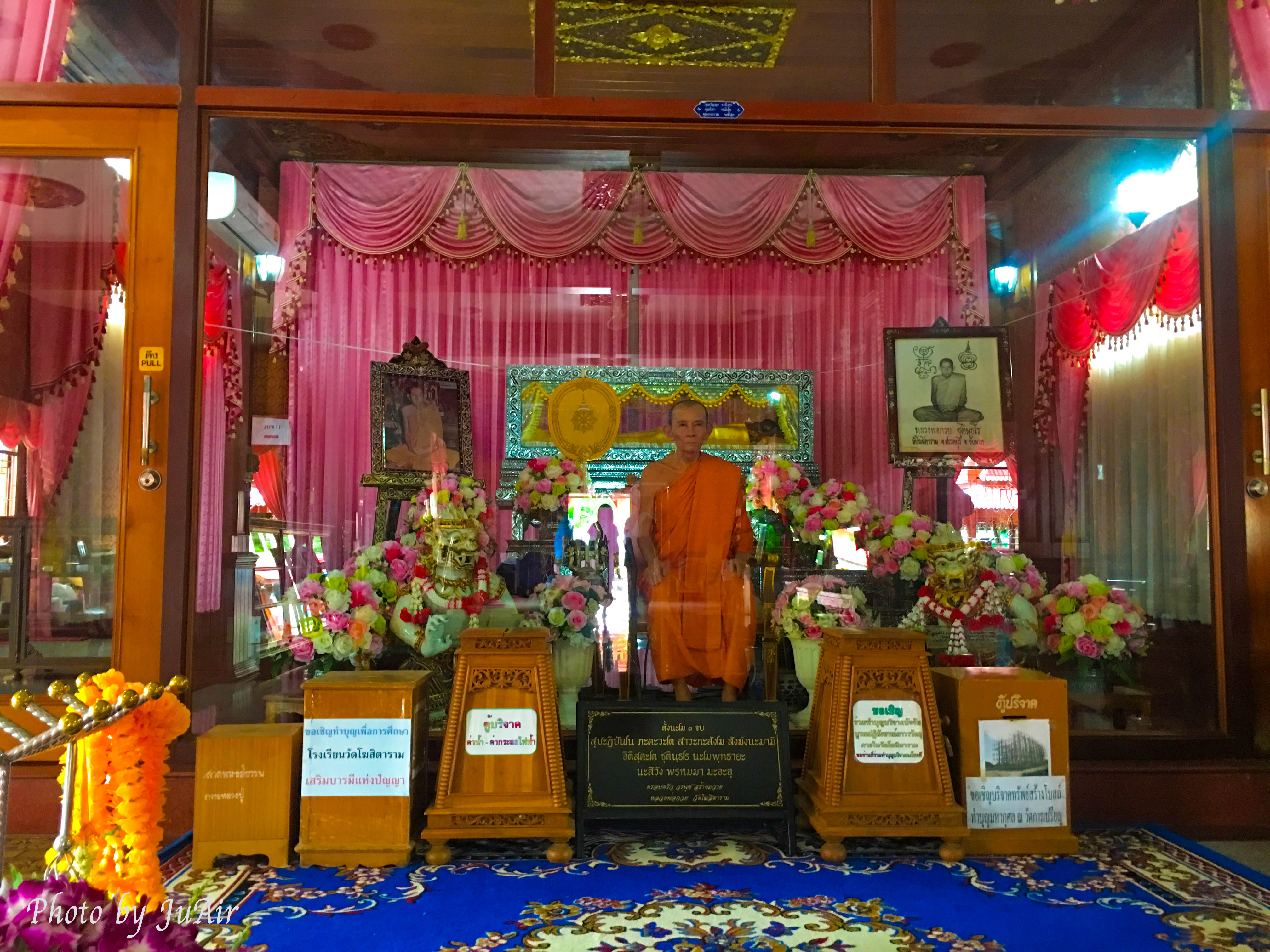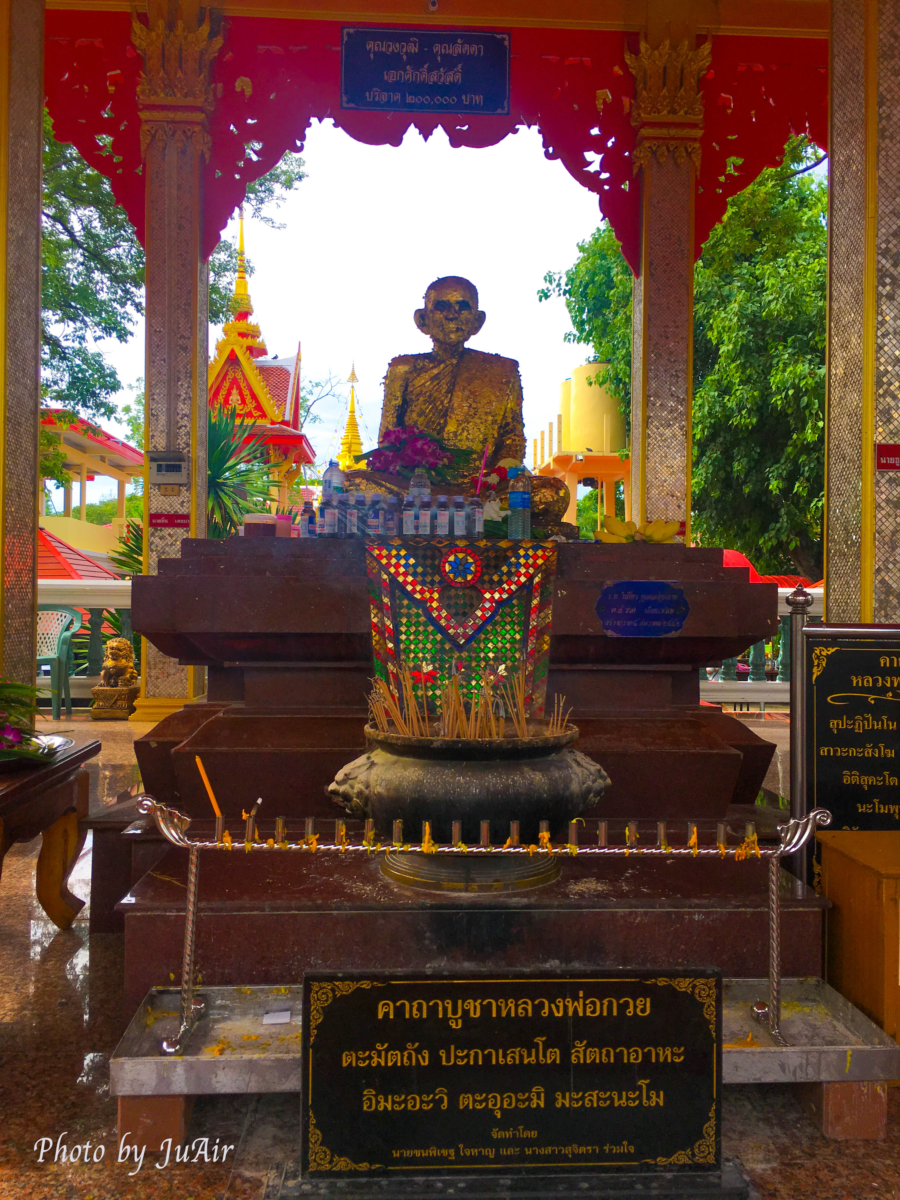 - จุดแรกจะพาไปกราบไหว้สักการะรูปหล่อของหลวงพ่อกวยกันก่อนค่ะ รูปหล่อองค์นี้สร้างเมื่อตอนบั้นปลายชีวิตของหลวงพ่อกวย คือในปี พ.ศ. 2522 ซึ่งมีเรื่องเล่ากันว่าหลวงพ่อกวยได้เพ่งกระแสจิตในการสร้างรูปหล่อนี้ด้วย (เป็นความเชื่อส่วนบุคคลนะคะ)