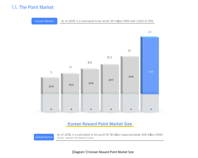 ตลาด Global Point อยู่ในช่วงขยายตัวอย่างรวดเร็วและก้าวร้าวซึ่งเติบโตอย่างต่อเนื่องทุกปี ปัจจุบันบริการจุดถูกนำมาใช้ในอุตสาหกรรมต่างๆเพื่อการหาลูกค้าและวัตถุประสงค์ทางการตลาดและท้ายที่สุดเพื่อเพิ่มการไหลเข้าของรายได้ Korean Air ได้เปิดตัวระบบคะแนนเกาหลีเป็นครั้งแรกในปี 1984 ณ ปี 2019 ตลาดคะแนนของเกาหลีคาดว่าจะมีมูลค่าประมาณ 20 ล้านล้านวอนและ CAGR ได้รับการคาดหวังให้มากกว่า 10% ตามความเป็นจริงแล้วคะแนนสะสมไมล์ทั้งหมดที่ บริษัท บัตรเครดิตในประเทศจ่ายให้กับลูกค้าถึง 2.9 ล้านล้านวอนในปี 2017