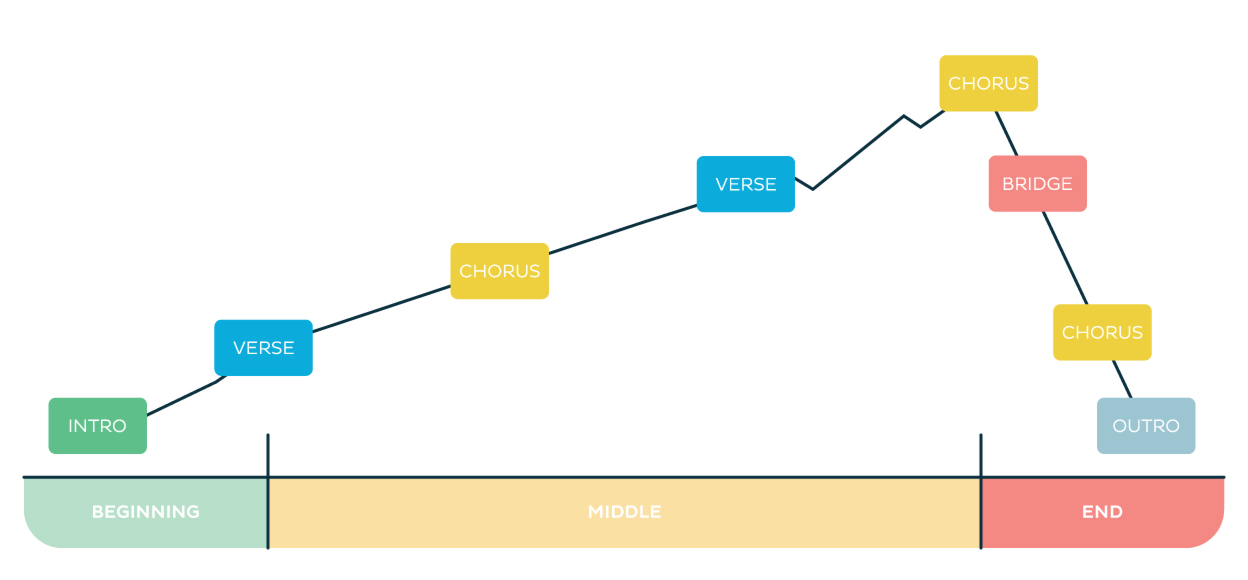 Hi, @alexwonderful, if you search about the structure of songs it uses the same pattern when it comes to putting music into moving pictures you have two way shooting 1- the musicians playing the song 2 - use some footage to make a video clip. Here the structure of songs in a graphic and compare with my story structure it is the same :