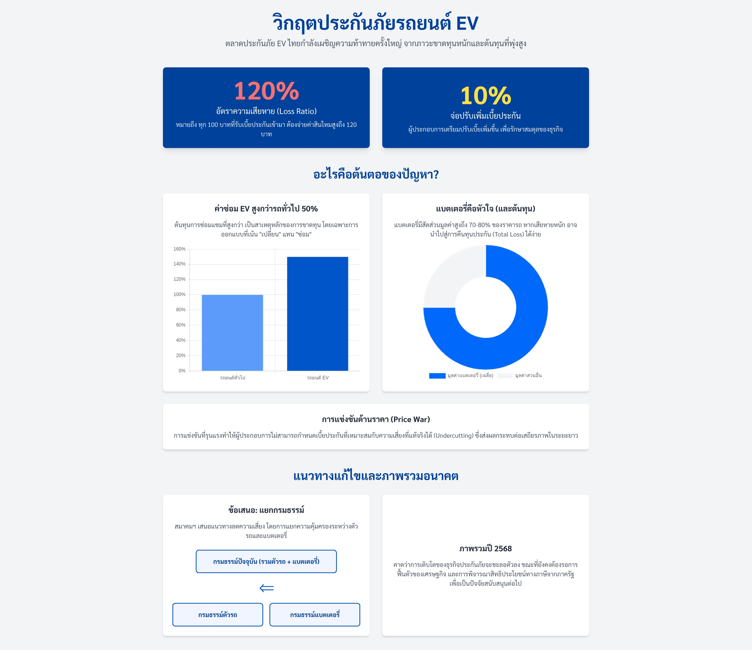 บทความนี้สรุปถึงภาวะขาดทุนอย่างรุนแรงของตลาดประกันภัยรถยนต์ไฟฟ้าในประเทศไทย ซึ่งกำลังผลักดันให้เกิดการปรับกลยุทธ์และเบี้ยประกันภัยครั้งใหญ่