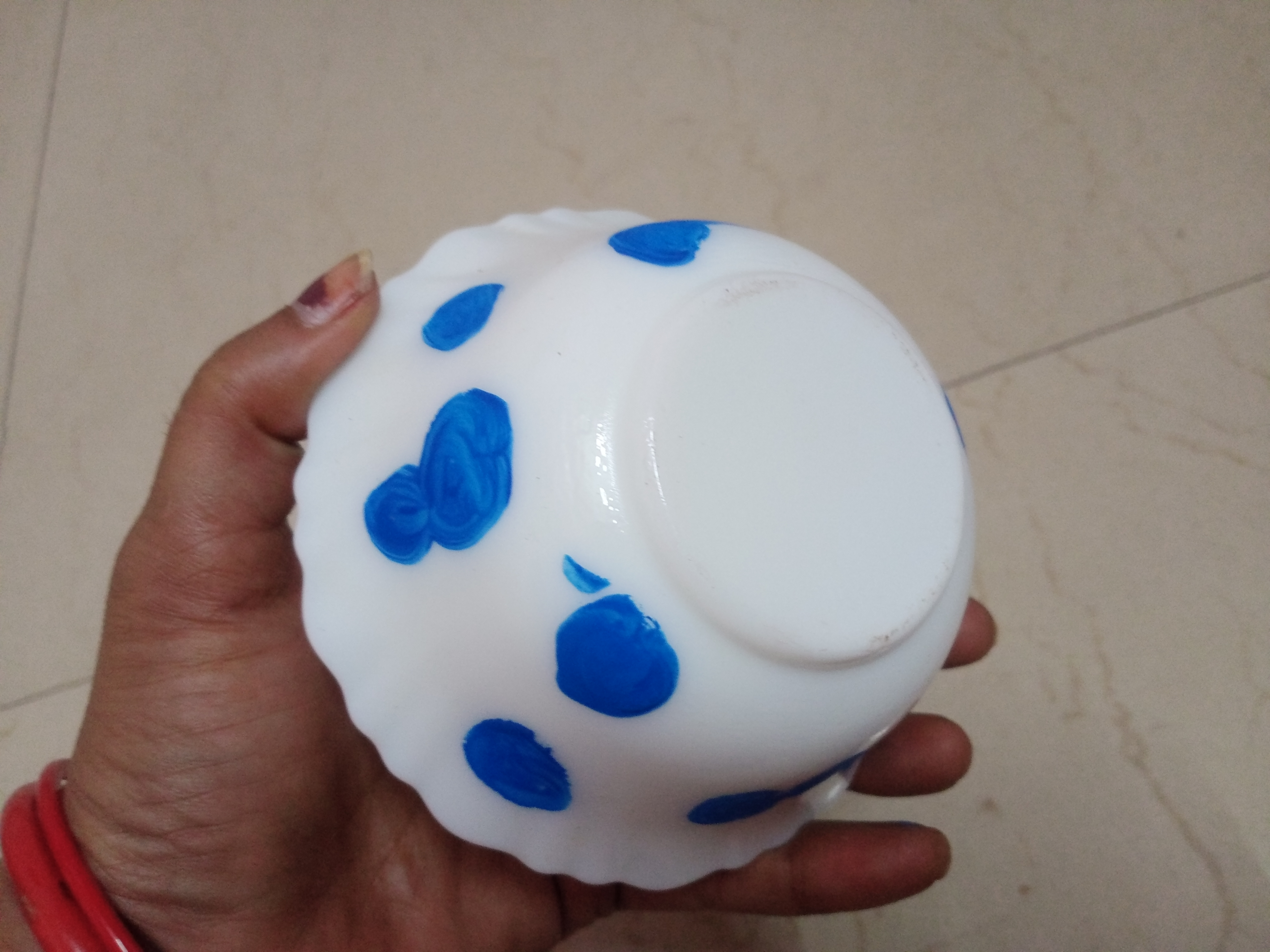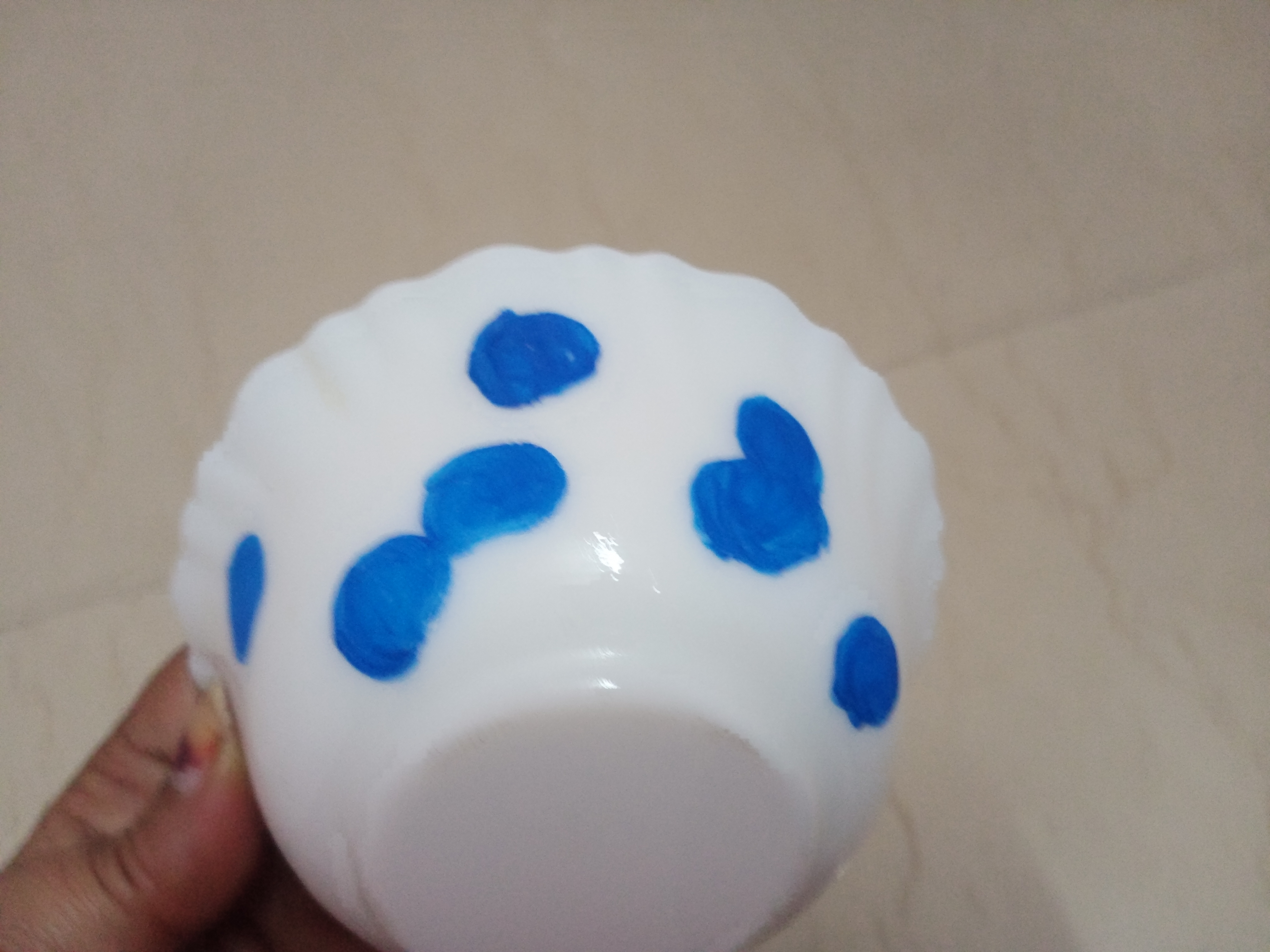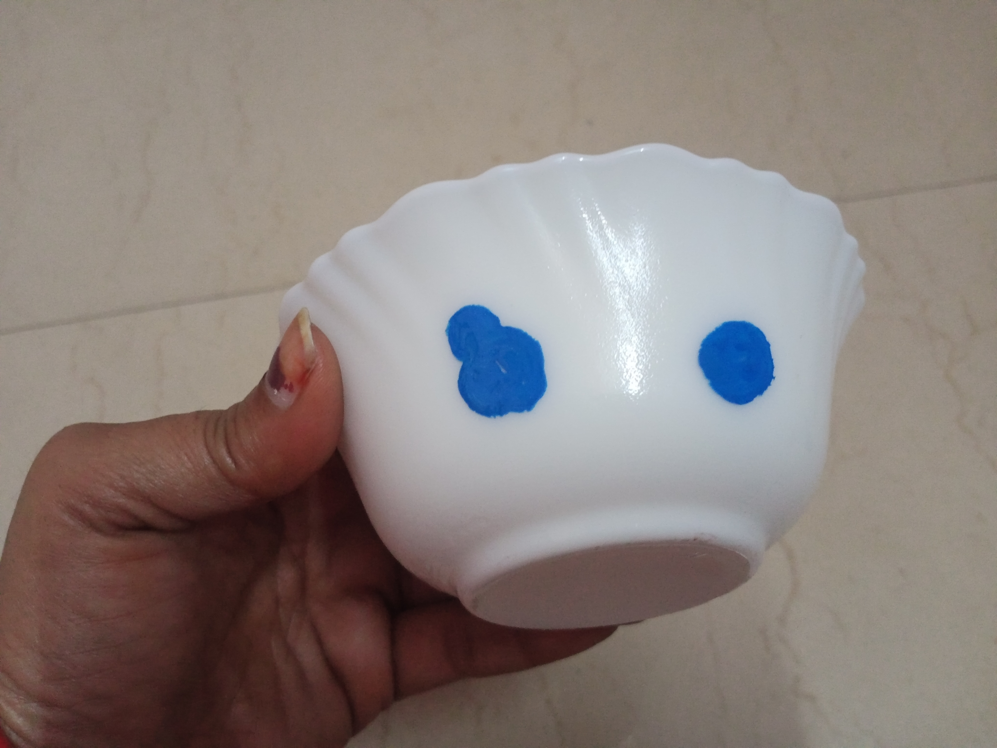 - First, I slightly dampened the brush. Then, using a small lid as a palette, I mixed a small amount of dark blue and light blue paint together. I then used this mixture to paint small dots—resembling little balls—onto the white bowl.