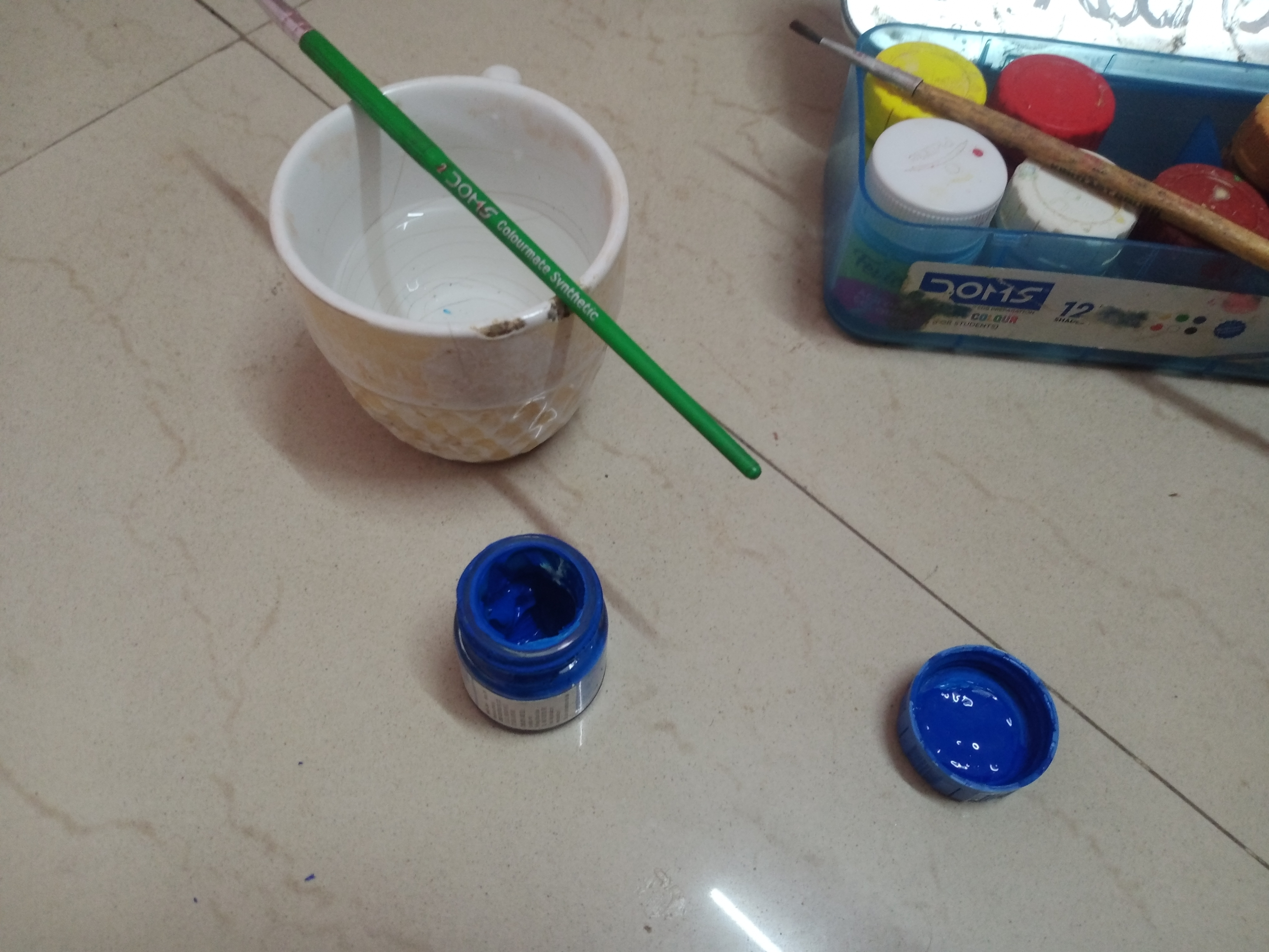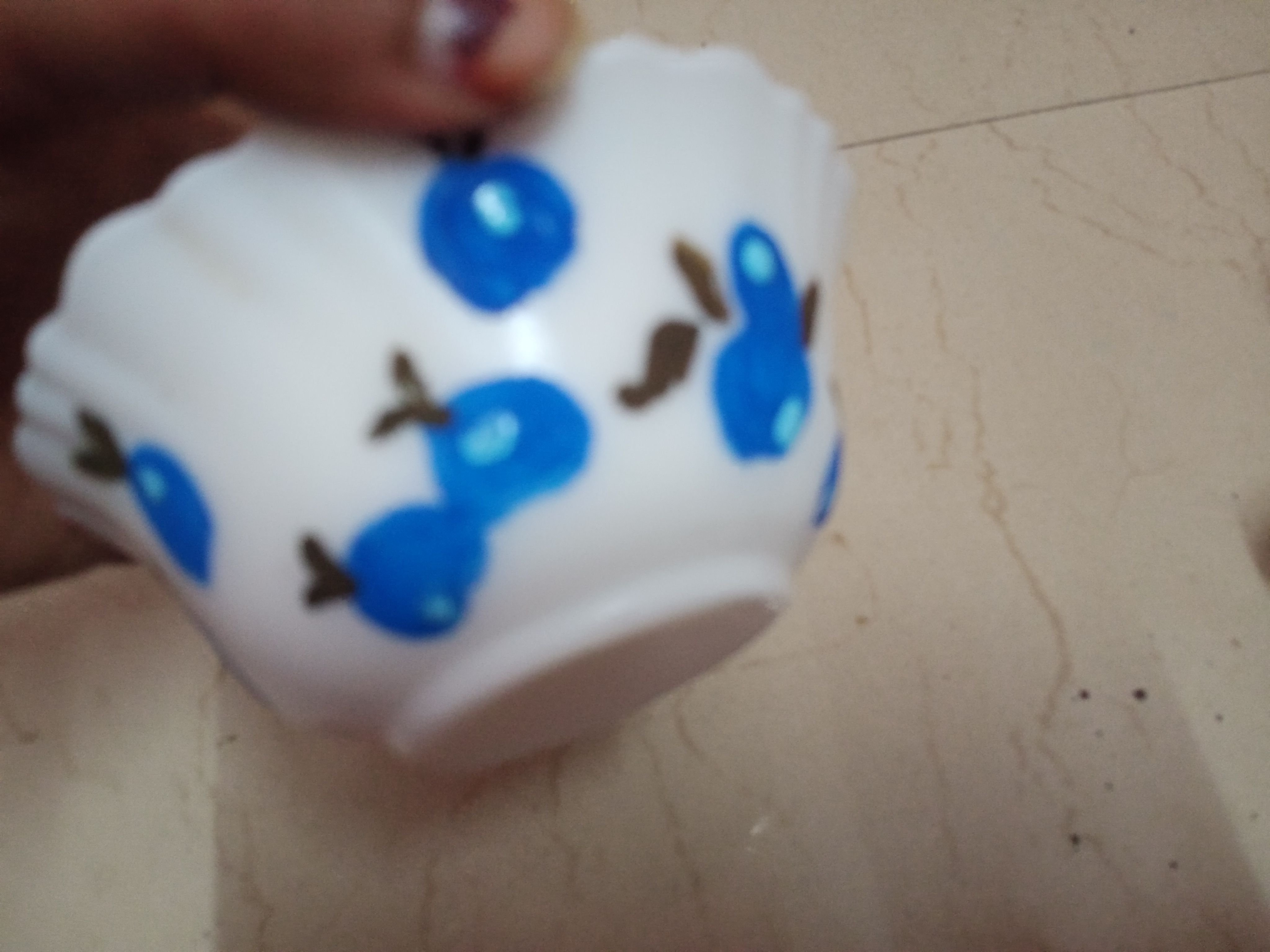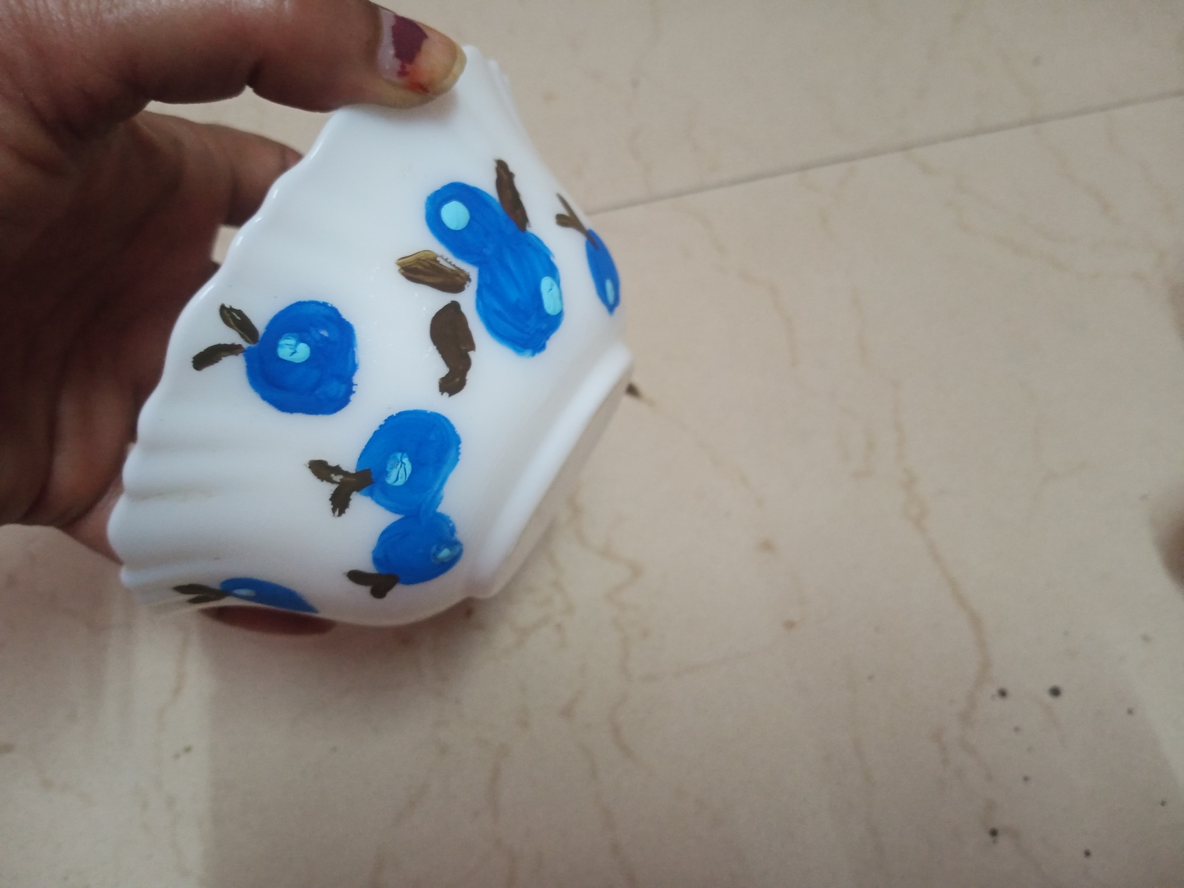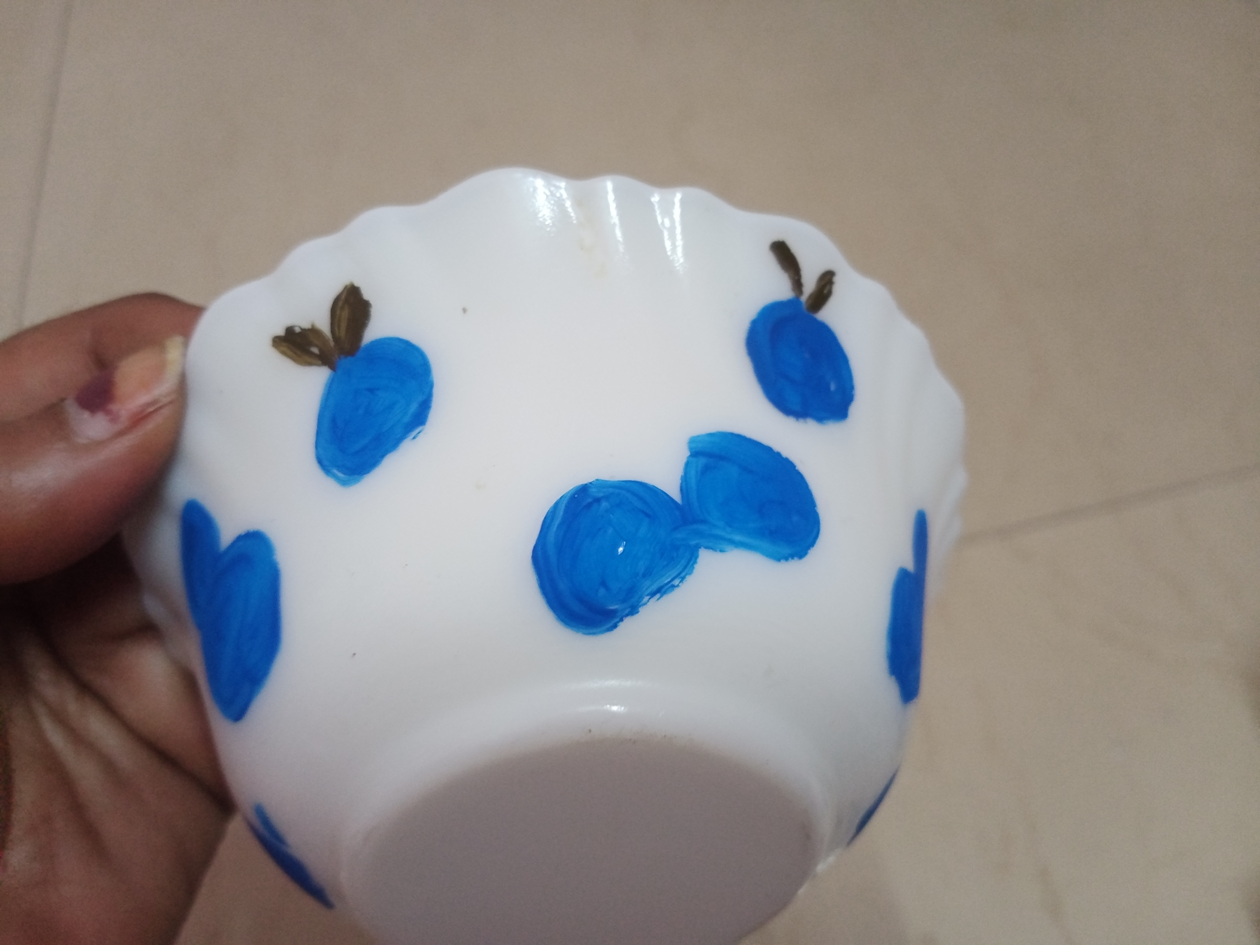 - First, I slightly dampened the brush. Then, using a small lid as a palette, I mixed a small amount of dark blue and light blue paint together. I then used this mixture to paint small dots—resembling little balls—onto the white bowl.