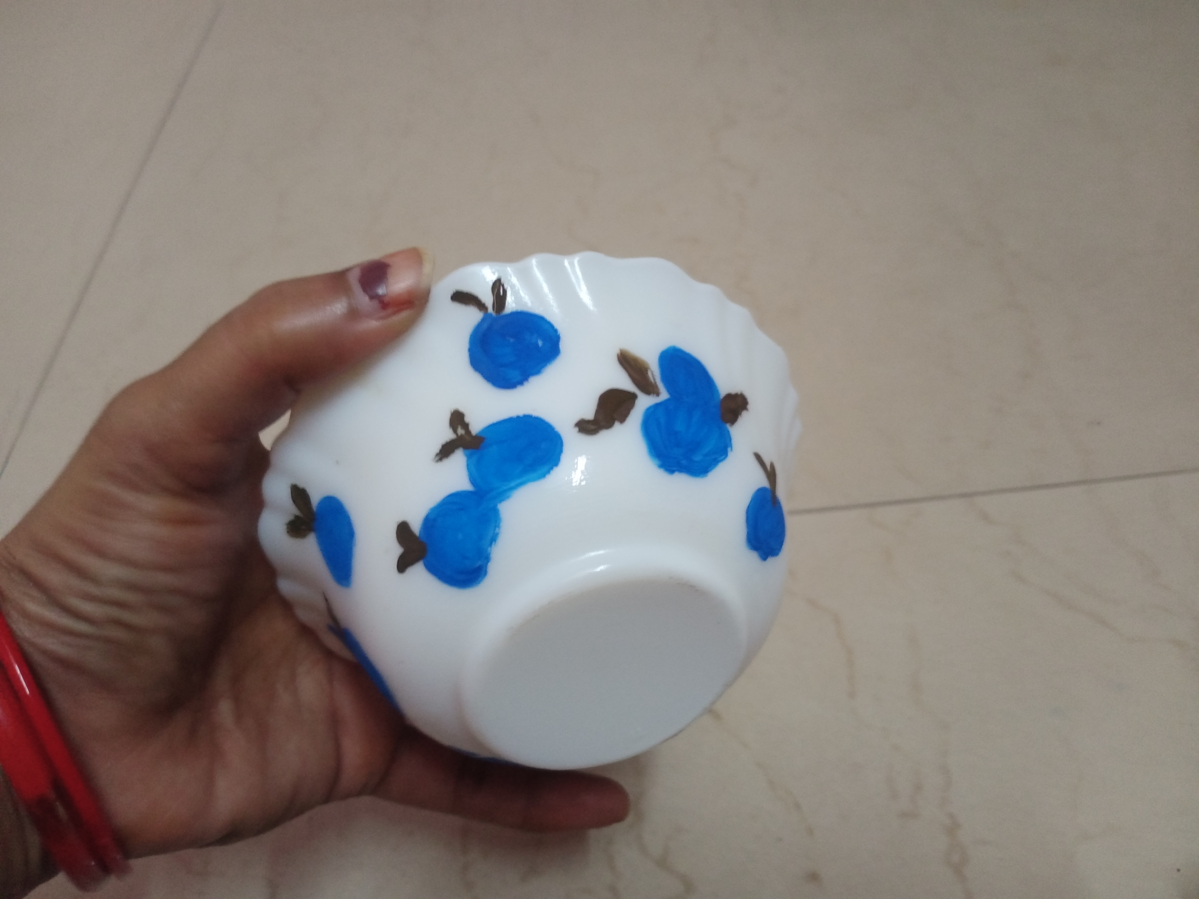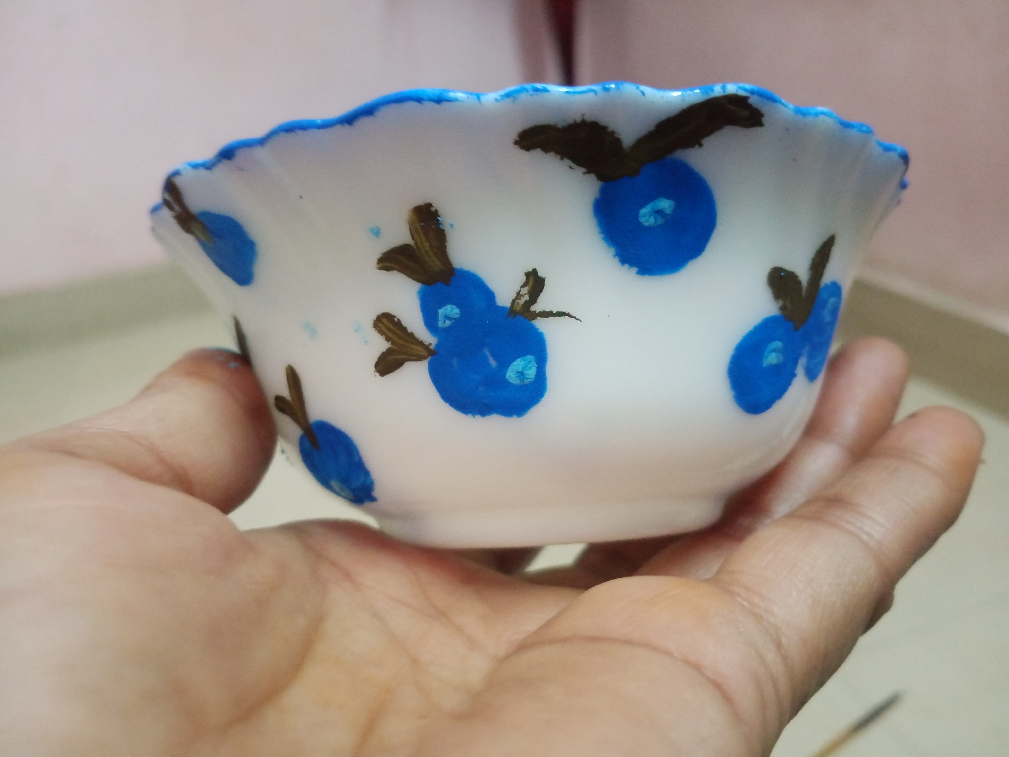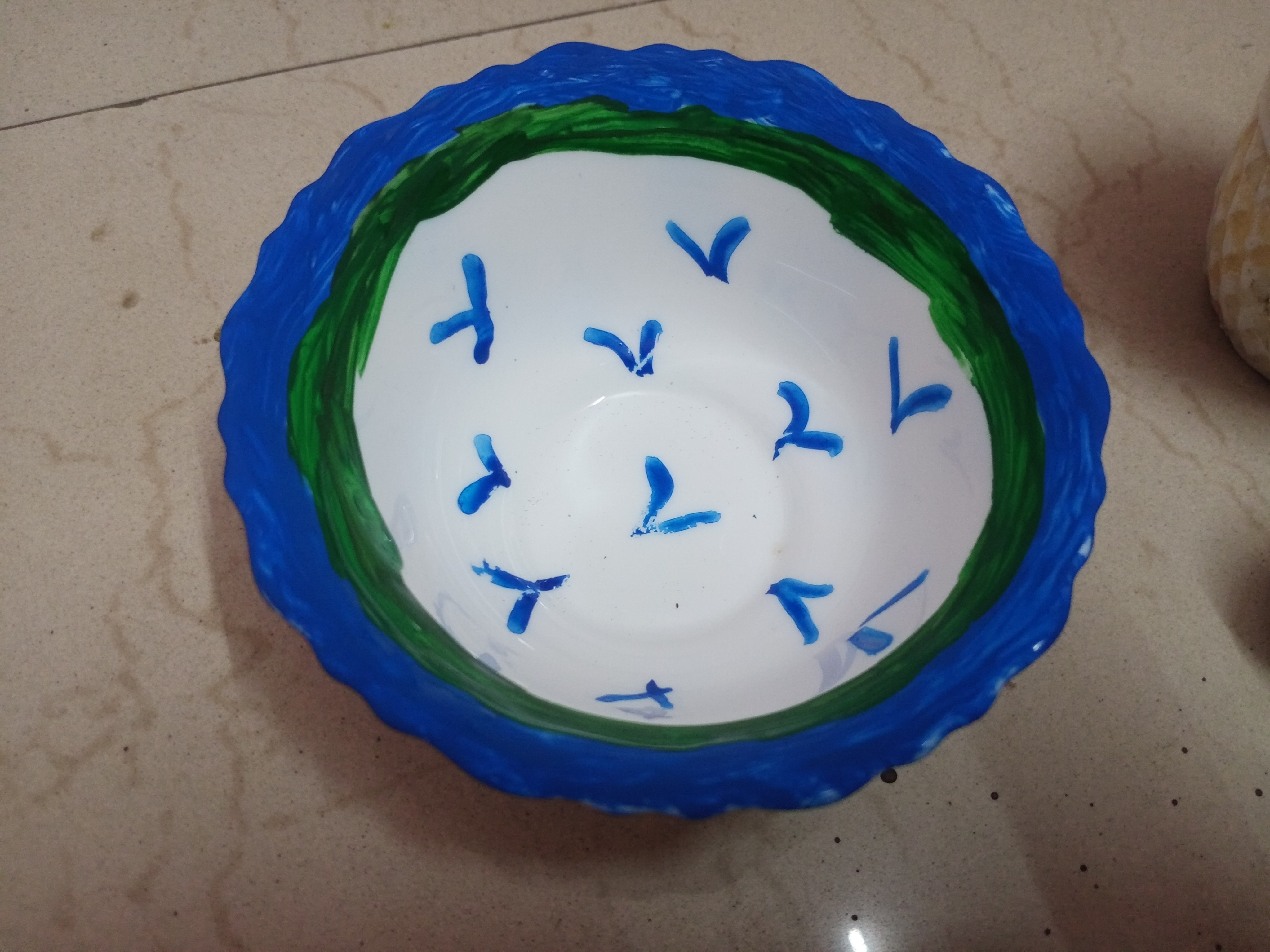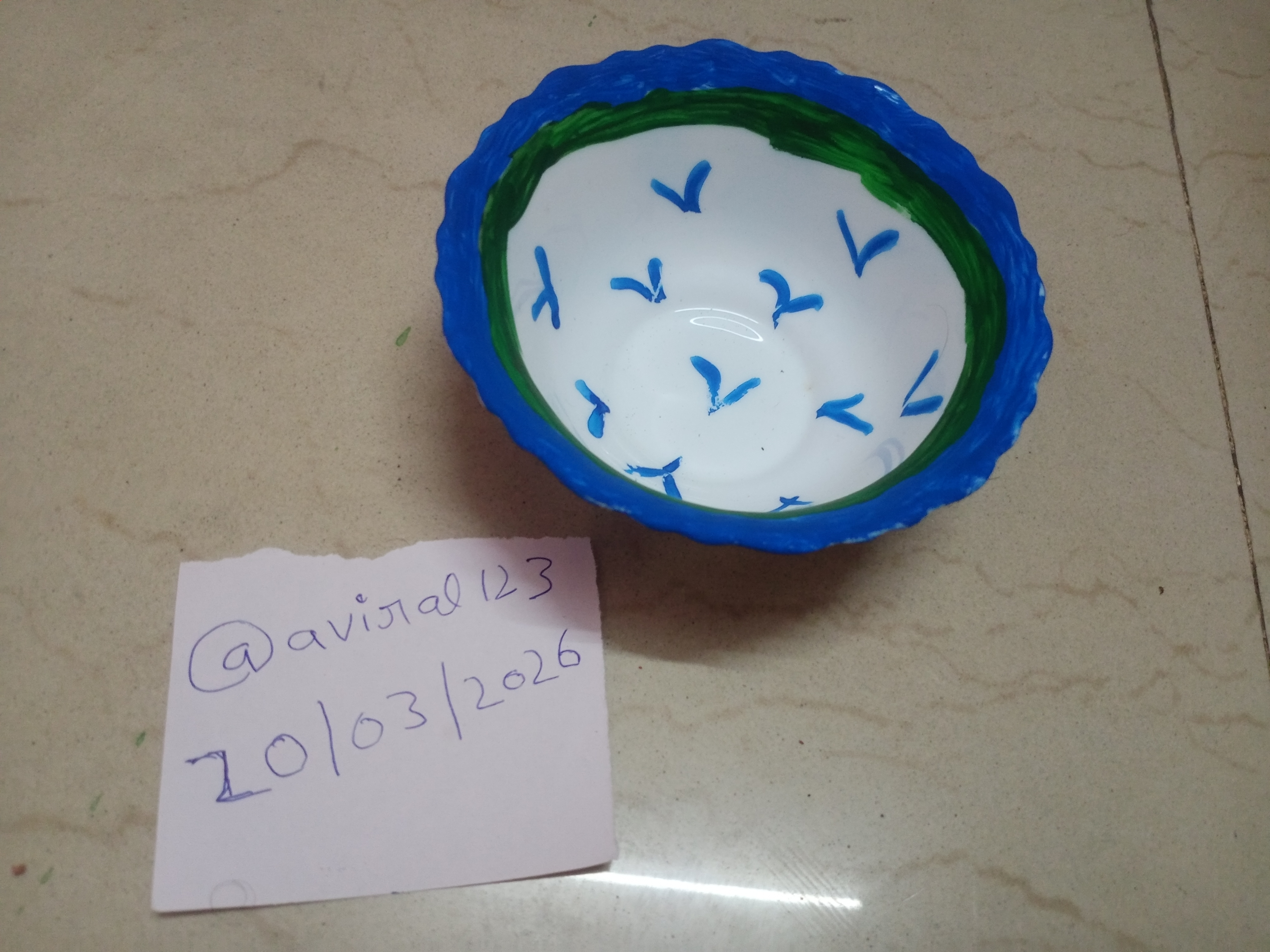 No, I had absolutely no prior experience with ceramic painting. This was my very first attempt. When I came across this competition, I felt a great sense of excitement at the prospect of learning something new and trying my hand at a new creative endeavor. I had never imagined that I would actually be painting on household items or similar objects myself; up until now, whatever little painting I had done had always been on fabric or paper. This was a completely new experience for me, and I thoroughly enjoyed the process. Furthermore, I didn't even have to buy a new bowl specifically for this competition; I happened to have a plain white bowl lying around at home, so I chose to use that one for my painting project. It was a novel experience not only for me but also for my family, seeing me engage in this kind of creative activity.